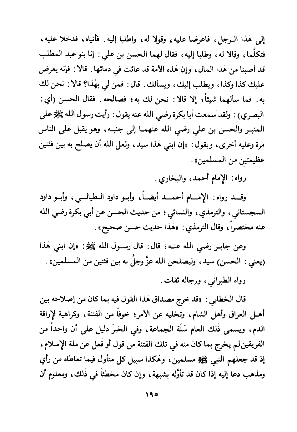 إلى هذا الرجل، فاعرضا عليه، وقولا له، واطلبا إليه. فأتياه، فدخلا عليه، فتكلما، وقالا له، وطلبا إليه، فقال لهما الحسن بن علي: إنا بنو عبد المطلب قد أصبنا من هذا المال، وإن هذه الأمة قد عاثت في دمائها. قالا: فإنه يعرض عليك كذا وكذا، ويطلب إليك، ويسألك. قال: فمن لي بهذا؟ قالا: نحن لك به. فما سألهما شيئا؛ إلا قالا: نحن لك به؛ فصالحه. فقال الحسن (أي: البصري) : ولقد سمعت أبا بكرة رضي الله عنه يقول: رأيت رسول الله صلى الله عليه وسلم على المنبر والحسن بن علي رضي الله عنهما إلى جنبه، وهو يقبل على الناس مرة وعليه أخرى، ويقول: «إن ابني هذا سيد، ولعل الله أن يصلح به بين فئتين عظيمتين من المسلمين» .