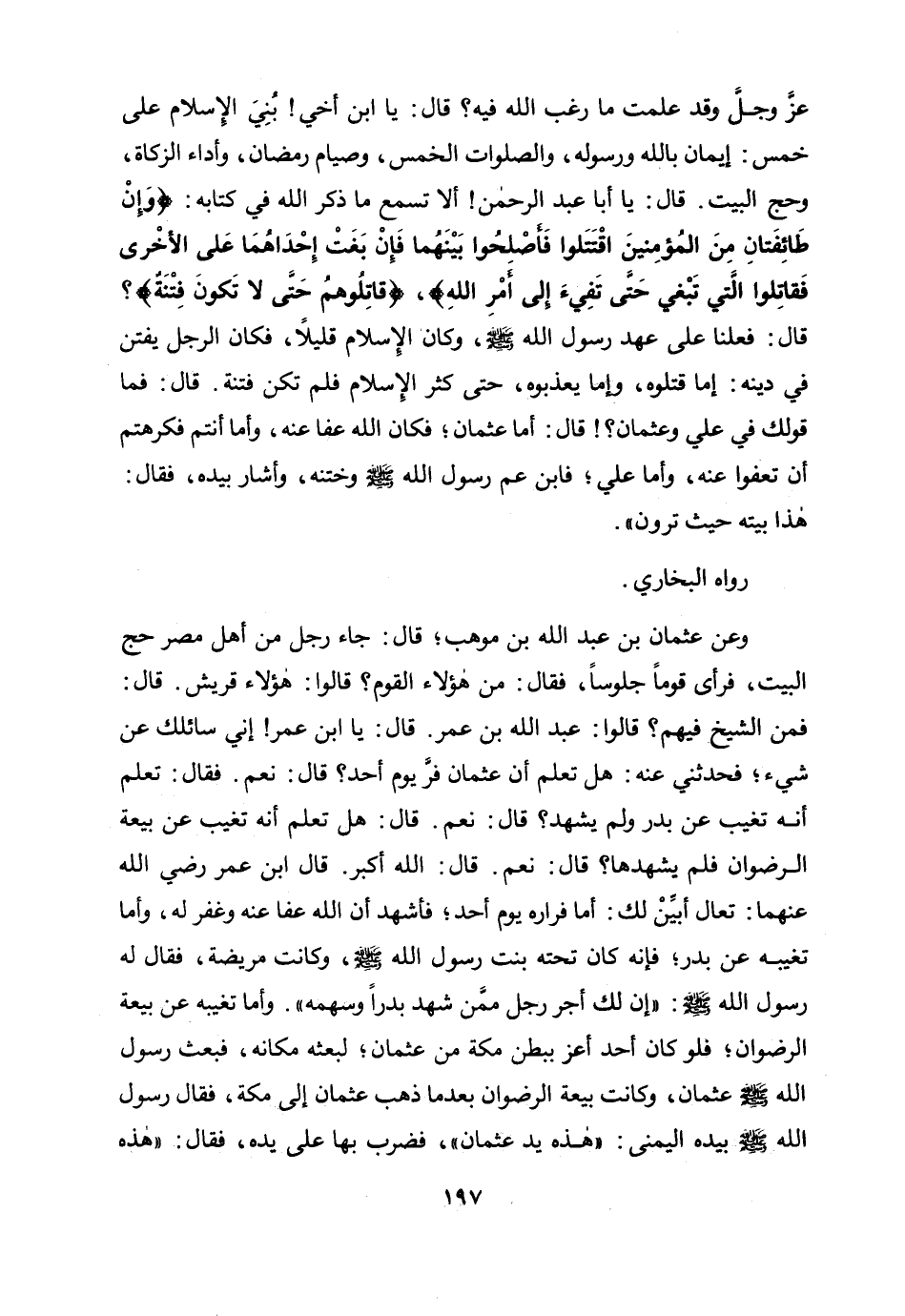 عز وجل وقد علمت ما رغب الله فيه؟ قال: يابن أخي! بني الإسلام على خمس: إيمان بالله ورسوله، والصلوات الخمس، وصيام رمضان، وأداء الزكاة، وحج البيت. قال: يا أبا عبد الرحمن! ألا تسمع ما ذكر الله في كتابه: {وَإِنْ طَائِفَتَانِ مِنَ الْمُؤْمِنِينَ اقْتَتَلُوا فَأَصْلِحُوا بَيْنَهُمَا فَإِنْ بَغَتْ إِحْدَاهُمَا عَلَى الْأُخْرَى فَقَاتِلُوا الَّتِي تَبْغِي حَتَّى تَفِيءَ إِلَى أَمْرِ اللَّهِ} ، {وَقَاتِلُوهُمْ حَتَّى لَا تَكُونَ فِتْنَةٌ} ؟ قال: فعلنا على عهد رسول الله صلى الله عليه وسلم، وكان الإسلام قليلا، فكان الرجل يفتن في دينه. إما قتلوه، وإما يعذبوه، حتى كثر الإسلام فلم تكن فتنة. قال: فما قولك في علي وعثمان؟ ! قال: أما عثمان؛ فكان الله عفا عنه، وأما أنتم فكرهتم أن تعفوا عنه، وأما علي؛ فابن عم رسول الله صلى الله عليه وسلم وختنه، وأشار بيده، فقال: هذا بيته حيث ترون".