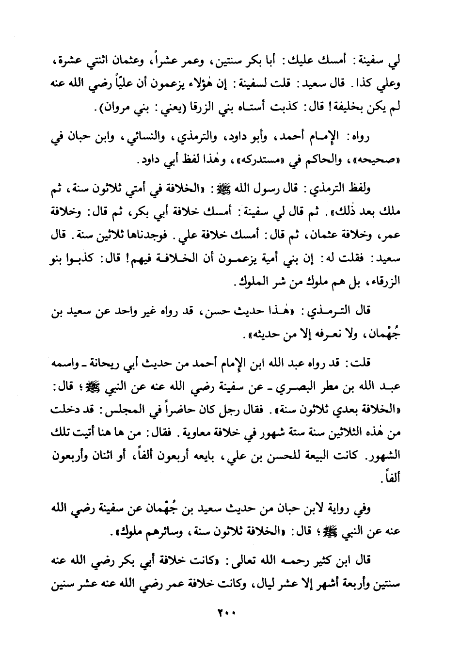 ولفظ الترمذي: قال رسول الله صلى الله عليه وسلم: «الخلافة في أمتي ثلاثون سنة، ثم ملك بعد ذلك» . ثم قال لي سفينة: أمسك خلافة أبي بكر، ثم قال: وخلافة عمر، وخلافة عثمان، ثم قال: أمسك خلافة علي. فوجدناها ثلاثين سنة. قال سعيد: فقلت له: إن بني أمية يزعمون أن الخلافة فيهم! قال: كذبوا بنو الزرقا، بل هم ملوك من شر المملوك.