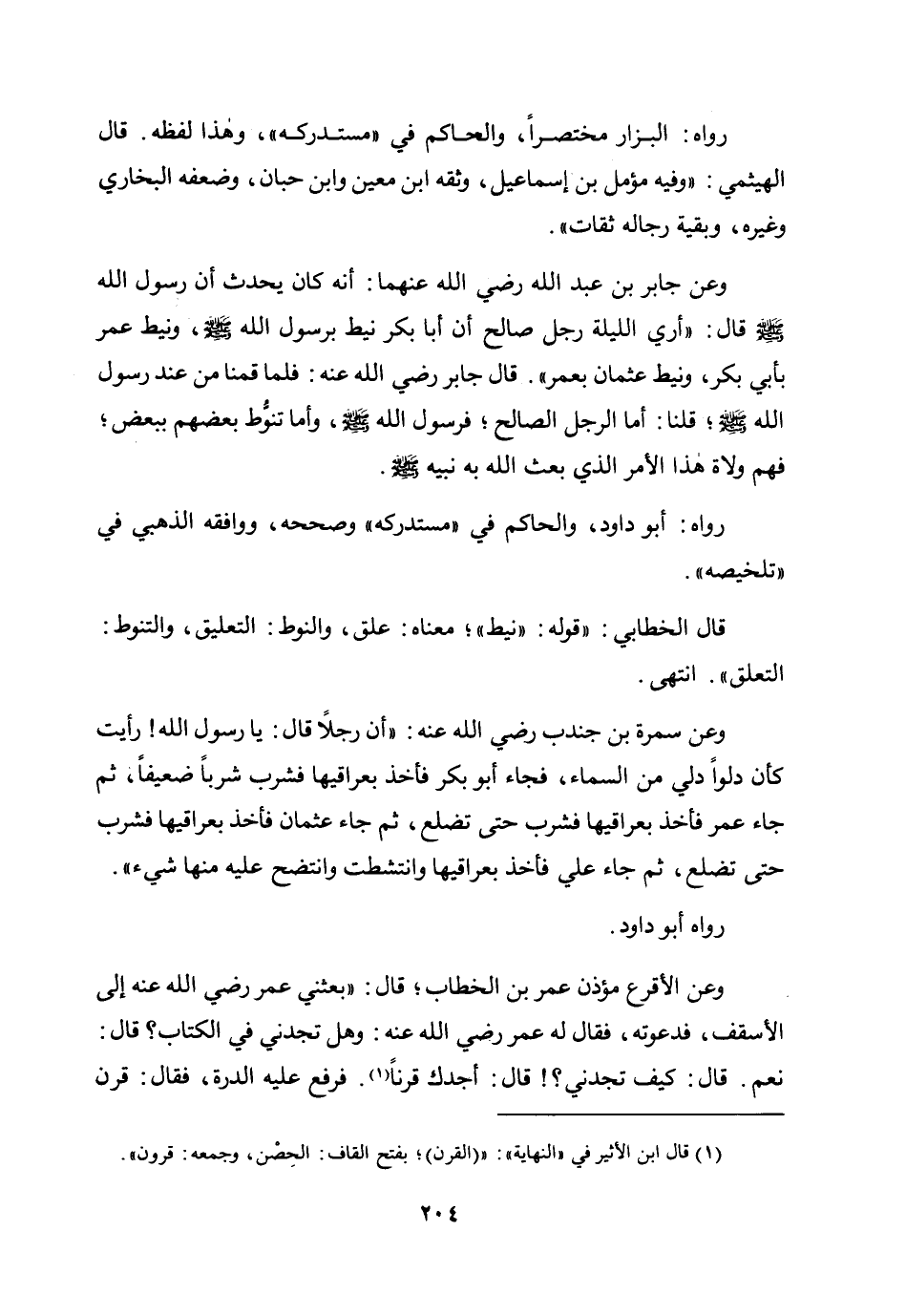وعن سمرة بن جندب رضي الله عنه: «"أن رجلًا قال: يا رسول الله! رأيت كأن دلوًا دلي من السماء، فجاء أبو بكر فأخذ بعراقيها فشرب شربًا ضعيفًا، ثم جاء عمر فأخذ بعراقيها فشرب حتى تضلع، ثم جاء عثمان فأخذ بعراقيها فشرب حتى تضلع، ثم جاء علي فأخذ بعراقيها وانتشطت وانتضح عليه منها شيء» .