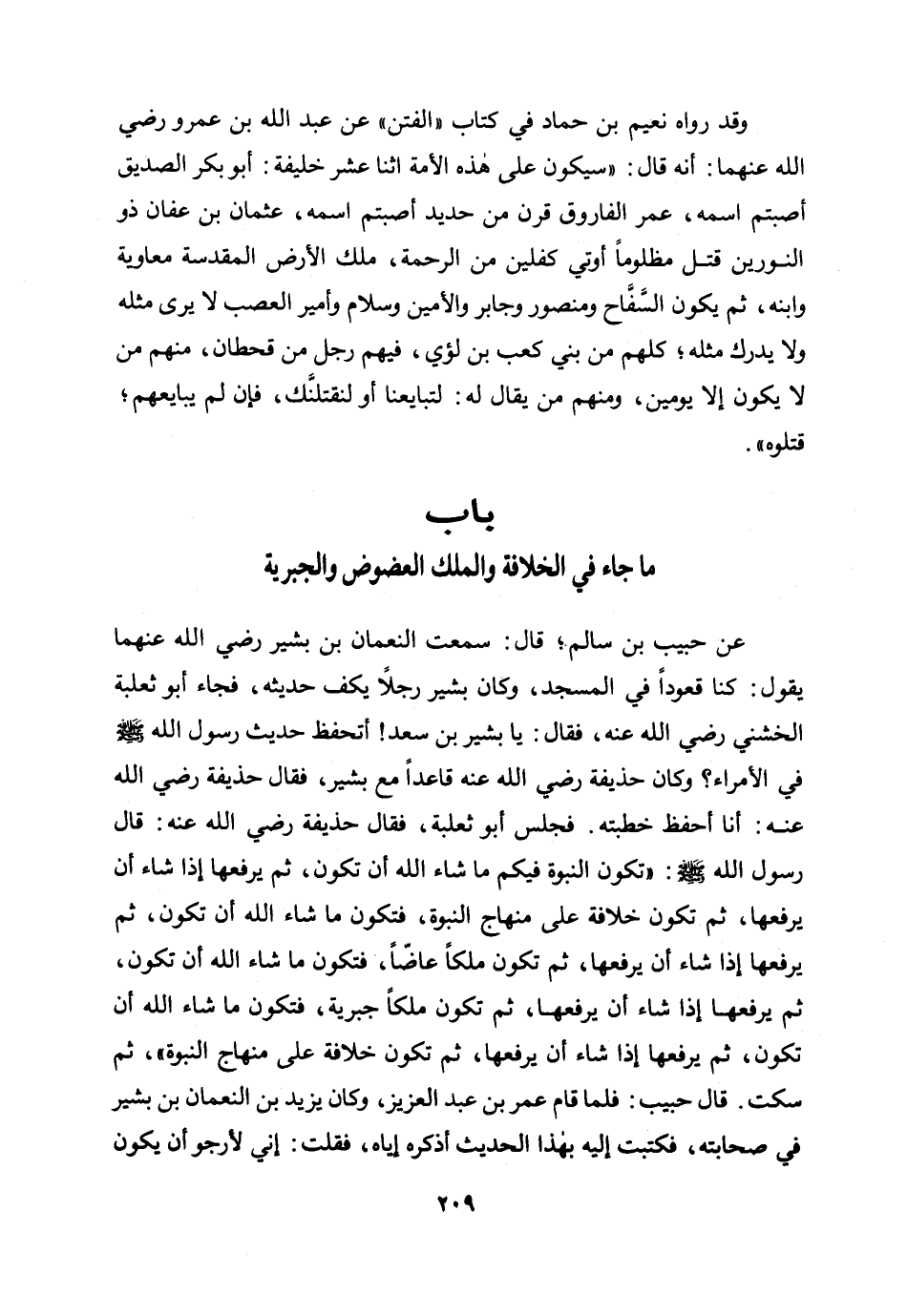 عن حبيب بن سالم؛ قال: سمعت النعمان بن بشير رضي الله عنهما يقول: كنا قعودا في المسجد، وكان بشير رجلا يكف حديثه، فجاء أبو ثعلبة الخشني رضي الله عنه، فقال: يا بشير بن سعد! أتحفظ حديث رسول الله صلى الله عليه وسلم في الأمراء؟ وكان حذيفة رضي الله عنه قاعدا مع بشير، فقال حذيفة رضي الله عنه: أنا أحفظ خطبته. فجلس أبو ثعلبة، فقال حذيفة رضي الله عنه: قال رسول الله صلى الله عليه وسلم: «تكون النبوة فيكم ما شاء الله أن تكون، ثم يرفعها إذا شاء أن يرفعها، ثم تكون خلافة على منهاج النبوة، فتكون ما شاء الله أن تكون، ثم يرفعها إذا شاء أن يرفعها، ثم تكون ملكًا عاضًا، فتكون ما شاء الله أن تكون، ثم يرفعها إذا شاء أن يرفعها، ثم تكون ملكًا جبرية، فتكون ما شاء الله أن تكون، ثم يرفعها إذا شاء أن يرفعها، ثم تكون خلافة على منهاج النبوة» ، ثم سكت. قال حبيب: فلما قام عمر بن عبد العزيز، وكان يزيد بن النعمان بن بشير في صحابته، فكتبت إليه بهذا الحديث أذكره إياه، فقلت: إني لأرجو أن يكون