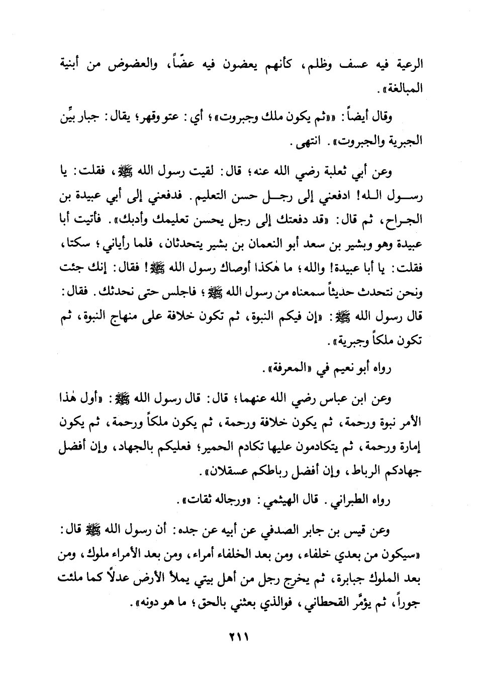 وعن قيس بن جابر الصدفي عن أبيه عن جده: أن رسول الله صلى الله عليه وسلم قال: «سيكون من بعدي خلفاء، ومن بعد الخلفاء أمراء، ومن بعد الأمراء ملوك، ومن بعد الملوك جبابرة، ثم يخرج من أهل بيتي يملأ الأرض عدلًا كما ملئت جورًا، ثم يؤمر القحطاني، فوالذي بعثني بالحق ما هو دونه» .