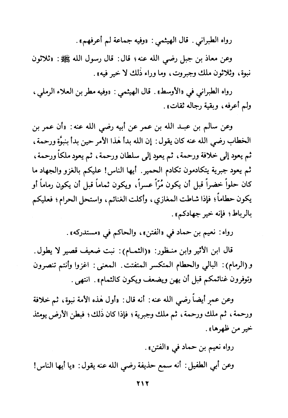 وعن سالم بن عبد الله بن عمر عن أبيه رضي الله عنه: "أن عمر بن الخطاب رضي الله عنه كان يقول: إن الله بدأ هذا الأمر حين بدأ بنبوة ورحمة، ثم يعود إلى خلافة ورحمة، ثم يعود إلى سلطان ورحمة، ثم يعود ملكا ورحمة، ثم يعود جبرية يتكادمون تكادم الحمير. أيها الناس! عليكم بالغزو والجهاد ما كان حلوا خضرا قبل أن يكون مرا عسرا، ويكون ثماما قبل أن يكون رماما أو يكون حطاما؛ فإذا شاطت المغازي، وأكلت الغنائم، واستحل الحرام؛ فعليكم بالرباط فإنه خير جهادكم".