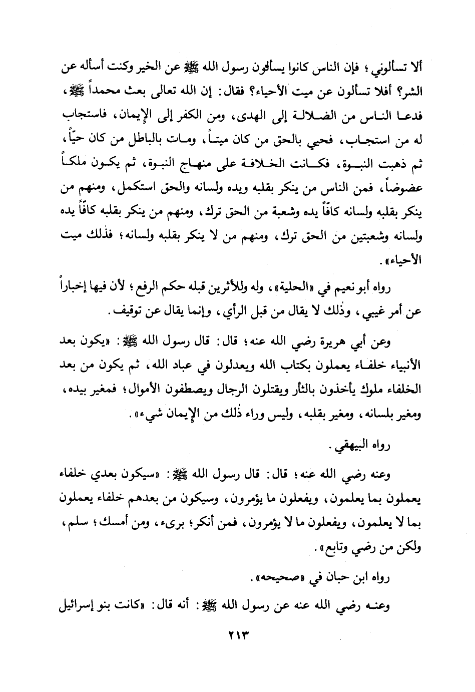 وعن أبي هريرة رضي الله عنه؛ قال: قال رسول الله صلى الله عليه وسلم: «يكون بعد الأنبياء خلفاء يعملون بكتاب الله ويعدلون في عباد الله، ثم يكون من بعد الخلفاء ملوك يأخذون بالثأر ويقتلون الرجال ويصطفون الأموال؛ فمغير بيده، ومغير بلسانه، ومغير بقلبه، وليس وراء ذلك من الإيمان شيء» .