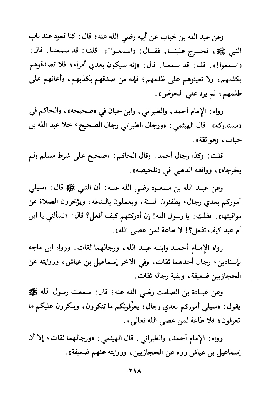 وعن عبد الله بن خباب عن أبيه رضي الله عنه؛ قال: «كنا قعودا عند باب النبي صلى الله عليه وسلم، فخرج علينا، فقال: "اسمعوا! " قلنا: قد سمعنا. قال: "اسمعوا! " قلنا: قد سمعنا. قال: "إنه سيكون بعدي أمراء؛ فلا تصدقوهم بكذبهم، ولا تعينوهم على ظلمهم؛ فإنه من صدقهم بكذبهم، وأعانهم على ظلمهم؛ لم يرد علي الحوض» .