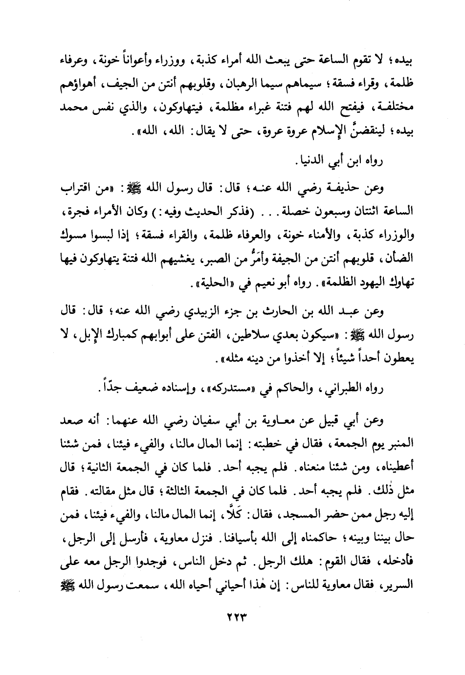 «بيده لا تقوم الساعة حتى يبعث الله أمراء كذبة، ووزراء وأعوانًا خونة، وعرفاء ظلمة، وقراء فسقة؛ سيماهم سيما الرهبان، وقلوبهم أنتن من الجيف، أهواؤهم مختلفة، فيفتح الله لهم فتنة غبراء مظلمة، فيتهاوكون، والذي نفس محمد بيده لينقضن الإسلام عروة عروة، حتى لا يقال: الله، الله» .
