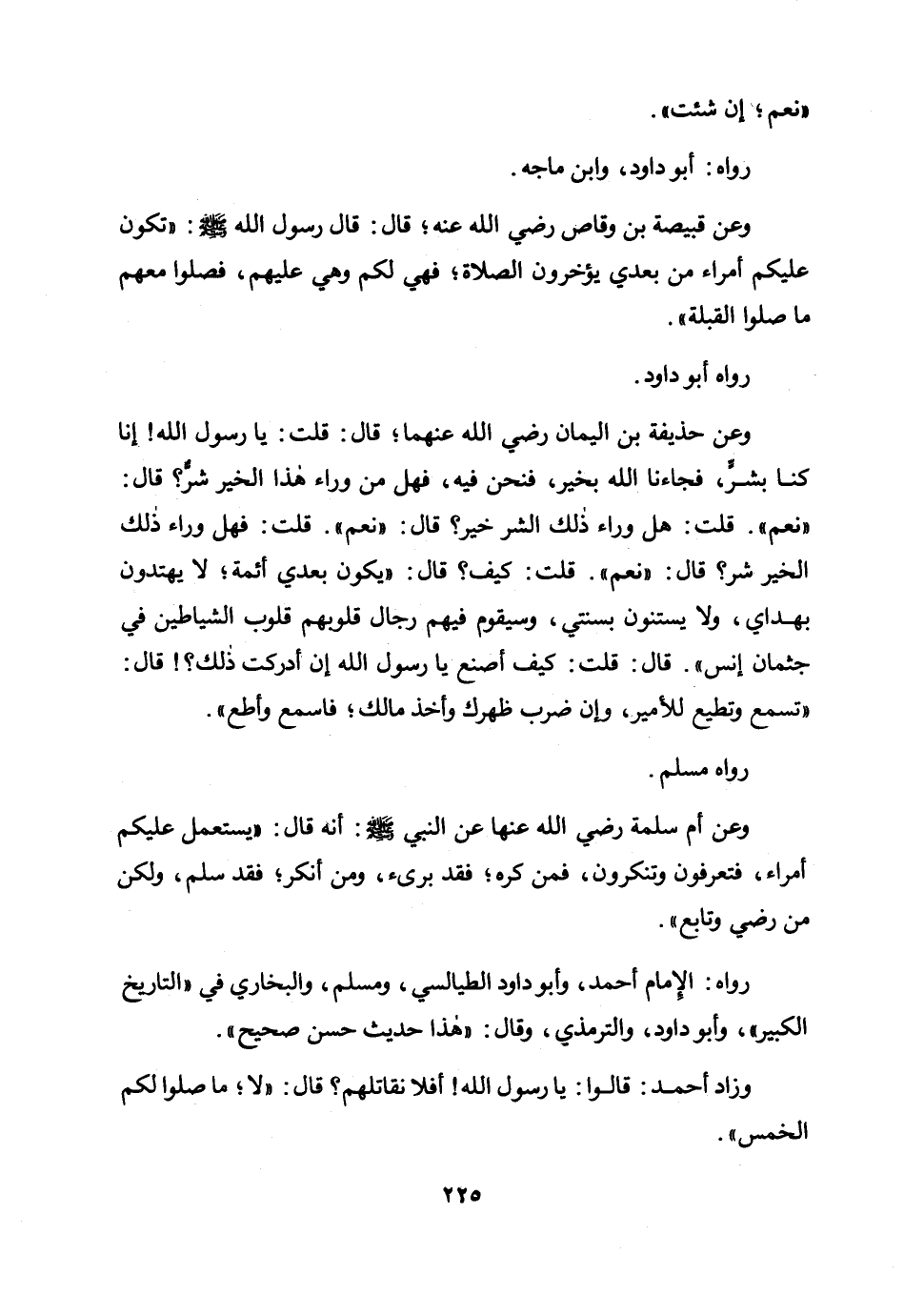وزاد أحمد: «وقالوا: يا رسول الله! أفلا نقاتلهم؟ قال: "لا ما صلوا لكم الخمس» .