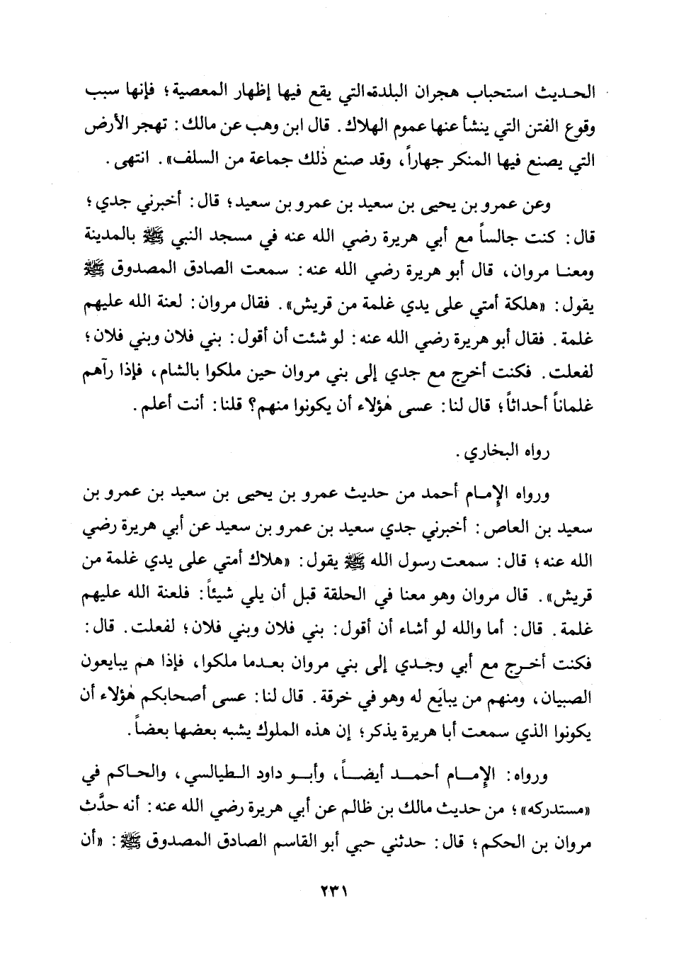 وعن عمرو بن يحيى بن سعيد بن عمرو بن سعيد؛ قال: أخبرني جدي؛ قال: كنت جالسا مع أبي هريرة رضي الله عنه في مسجد النبي صلى الله عليه وسلم بالمدينة ومعنا مروان، قال أبو هريرة رضي الله عنه: سمعت الصادق المصدوق صلى الله عليه وسلم يقول: «هلكة أمتي على يدي غلمة من قريش» . فقال مروان: لعنة الله عليهم غلمة. فقال أبو هريرة رضي الله عنه: لو شئت أن أقول: بني فلان وبني فلان؛ لفعلت. فكنت أخرج مع جدي إلى بني مروان حين ملكوا بالشام، فإذا رآهم غلمانا أحداثا قال لنا: عسى هؤلاء أن يكونوا منهم؟ قلنا: أنت أعلم.