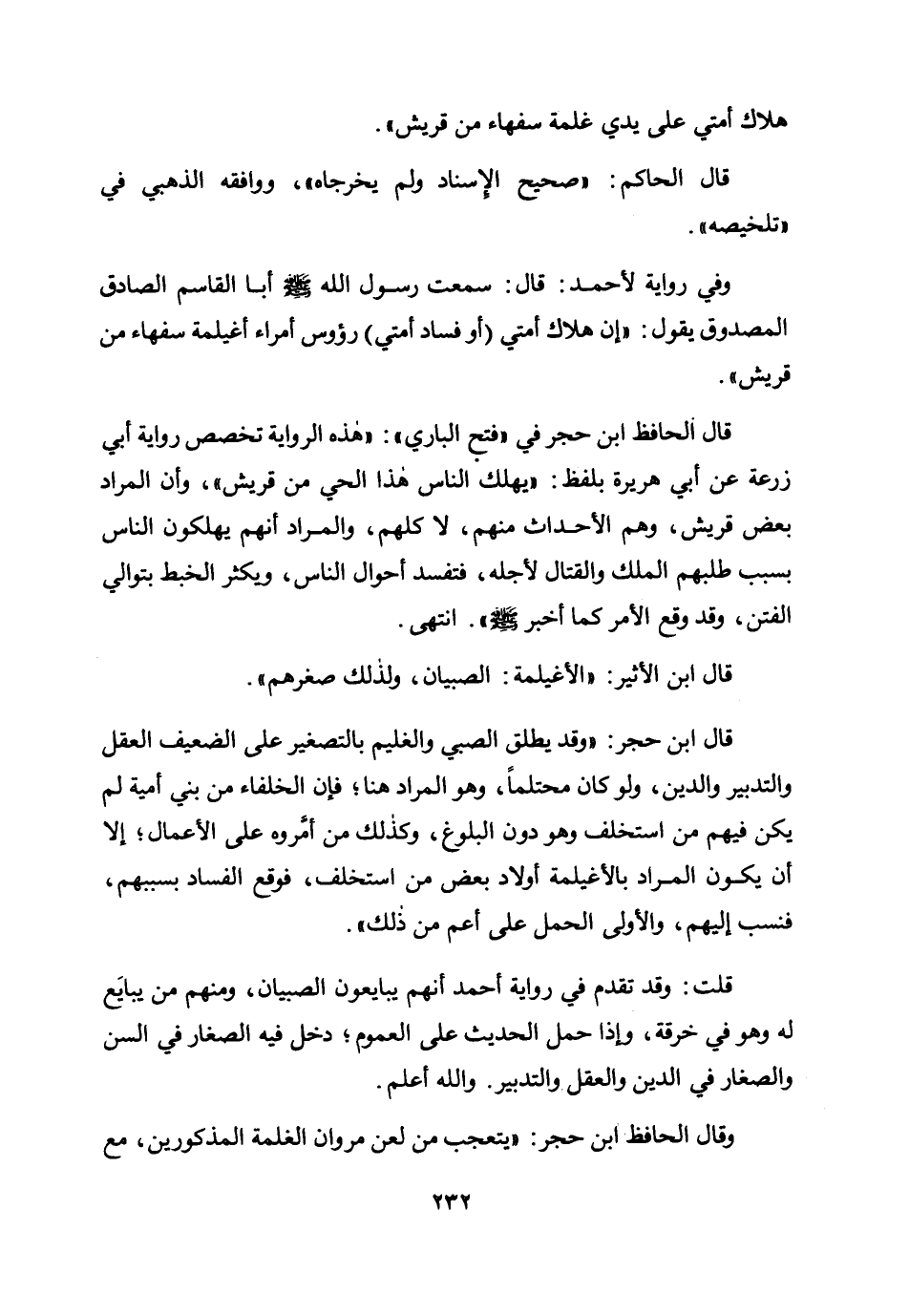 وفي رواية لأحمد: قال: سمعت رسول الله صلى الله عليه وسلم أبا القاسم الصادق المصدوق يقول: «إن هلاك أمتي (أو فساد أمتي) رؤوس أمراء أغيلمة سفهاء من قريش» .