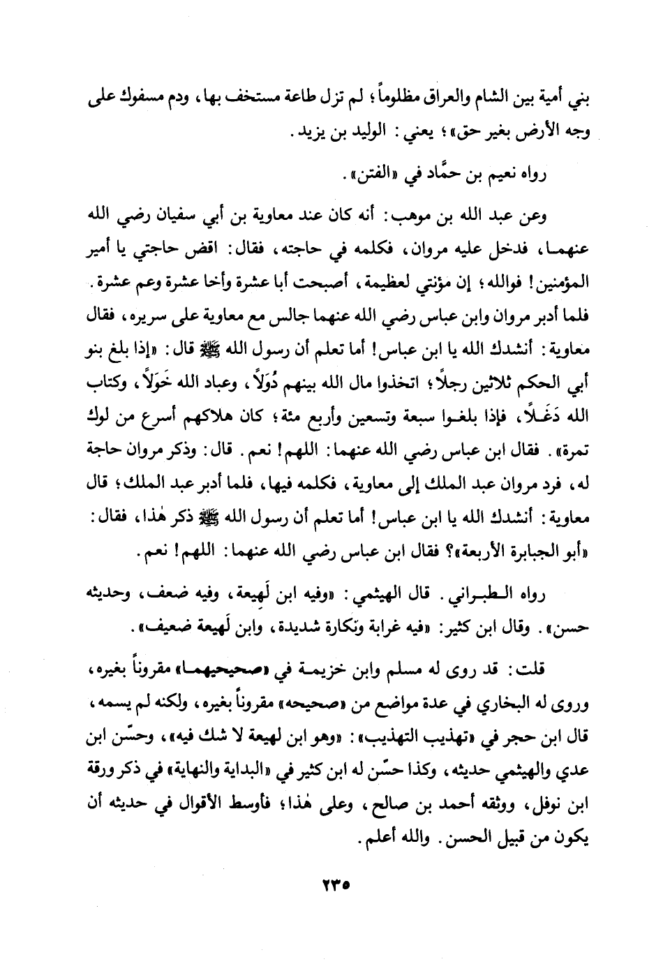 وعن عبد الله بن موهب: أنه كان عند معاوية بن أبي سفيان رضي الله عنهما، فدخل عليه مروان، فكلمه في حاجته، فقال: اقض حاجتي يا أمير المؤمنين! فوالله إن مؤنتي لعظيمة، أصبحت أبا عشرة وأخا عشرة وعم عشرة. فلما أدبر مروان وابن عباس رضي الله عنهما جالس مع معاوية على سريره، فقال معاوية: أنشدك الله يابن عباس! أما تعلم أن رسول الله صلى الله عليه وسلم قال: «إذا بلغ بنو أبي الحكم ثلاثين رجلًا؛ اتخذوا مال الله بينهم دولًا، وعباد الله خولًا، وكتاب الله دغلًا، فإذا بلغوا سبعة وتسعين وأربعمائة؛ كان هلاكهم أسرع من لوك تمرة» . فقال ابن عباس رضي الله عنهما: اللهم! نعم. قال: وذكر مروان حاجة له، فرد مروان عبد الملك إلى معاوية، فكلمه فيها، فلما أدبر عبد الملك؛ قال معاوية: أنشدك الله يابن عباس! أما تعلم أن رسول الله صلى الله عليه وسلم ذكر هذا، فقال: أبو الجبابرة الأربعة؟ فقال ابن عباس رضي الله عنهما: اللهم! نعم.