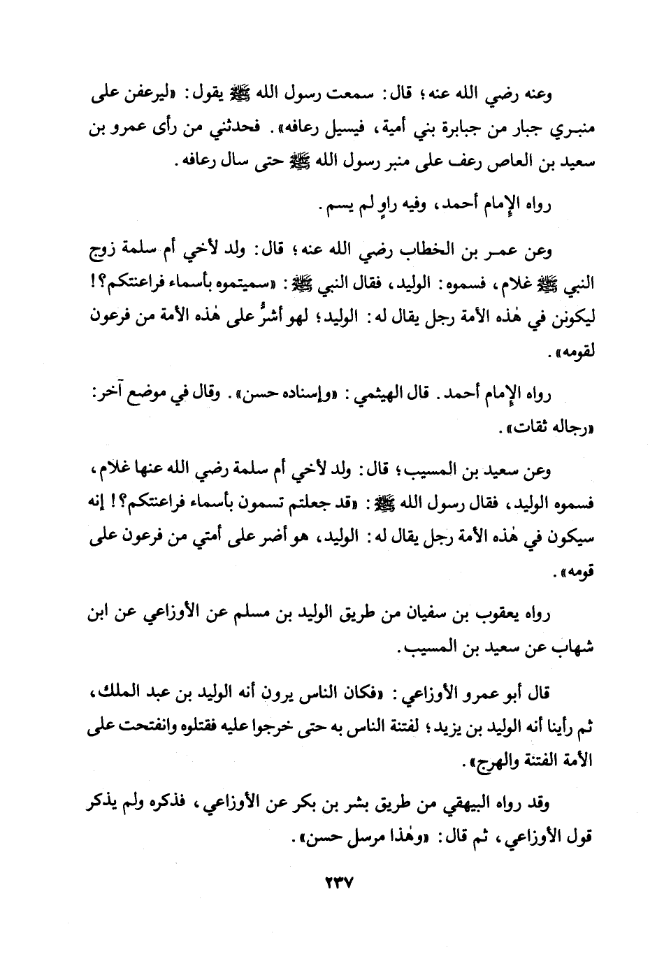 وعن عمر بن الخطاب رضي الله عنه؛ قال: «ولد لأخي أم سلمة زوج النبي صلى الله عليه وسلم غلام، فسموه: الوليد، فقال النبي صلى الله عليه وسلم: سميتموه بأسماء فراعنتكم؟ ! ليكونن في هذه الأمة رجل يقال له: الوليد؛ لهو أشر على هذه الأمة من فرعون لقومه» .