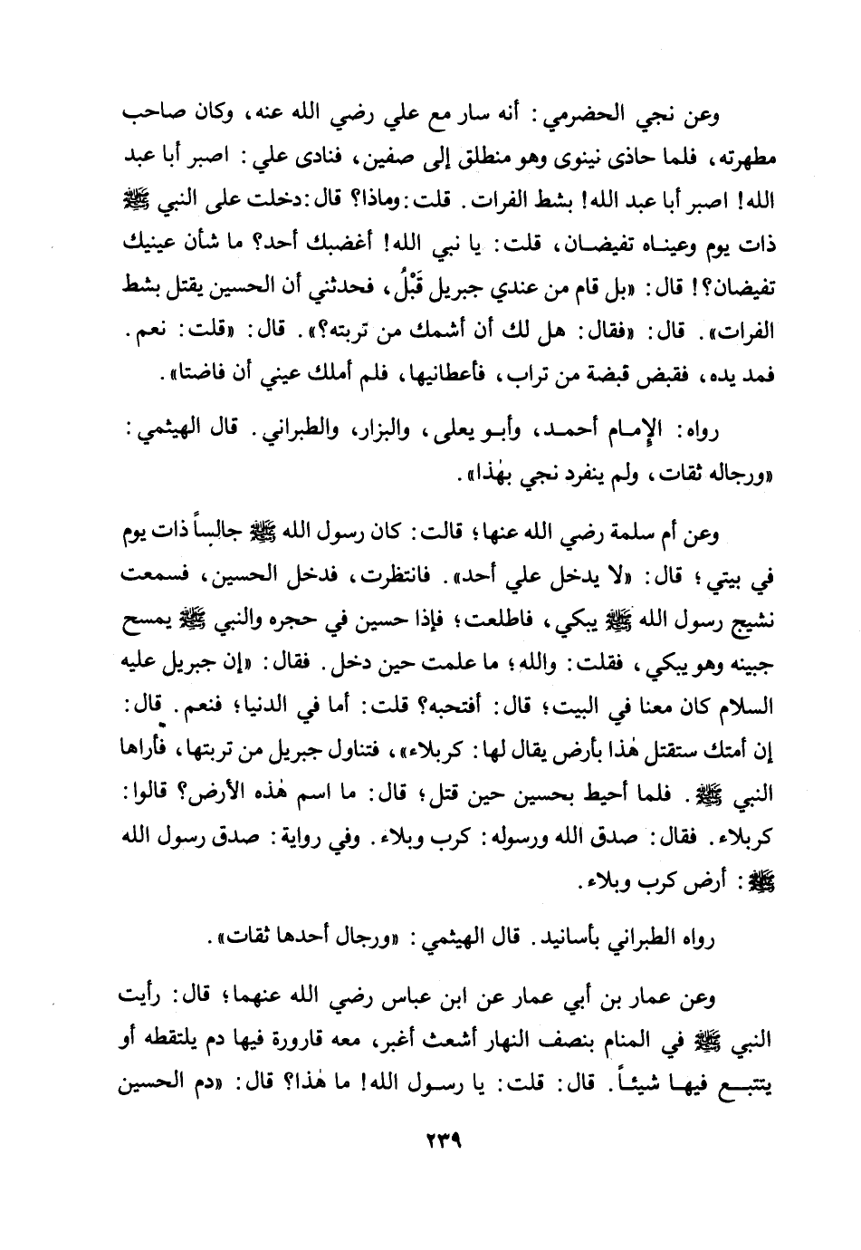 وعن أم سلمة رضي الله عنها؛ قالت: «كان رسول الله صلى الله عليه وسلم جالسًا ذات يوم في بيتي؛ قال: "لا يدخل علي أحد". فانتظرت، فدخل الحسين، فسمعت نشيج رسول الله صلى الله عليه وسلم يبكي، فاطلعت فإذا حسين في حجره والنبي صلى الله عليه وسلم يمسح جبينه وهو يبكي، فقلت: والله ما علمت حين دخل. فقال: "إن جبريل عليه السلام كان معنا في البيت؛ قال: أفتحبه؟ قلت: أما في الدنيا فنعم. قال: إن أمتك ستقتل هذا بأرض يقال لها: كربلاء"، فتناول جبريل من تربتها، فأراها النبي صلى الله عليه وسلم» . فلما أحيط بحسين حين قتل؛ قال: ما اسم هذه الأرض؟ قالوا: كربلاء. فقال: صدق الله ورسوله: كرب وبلاء. وفي رواية: صدق رسول الله صلى الله عليه وسلم: أرض كرب وبلاء.