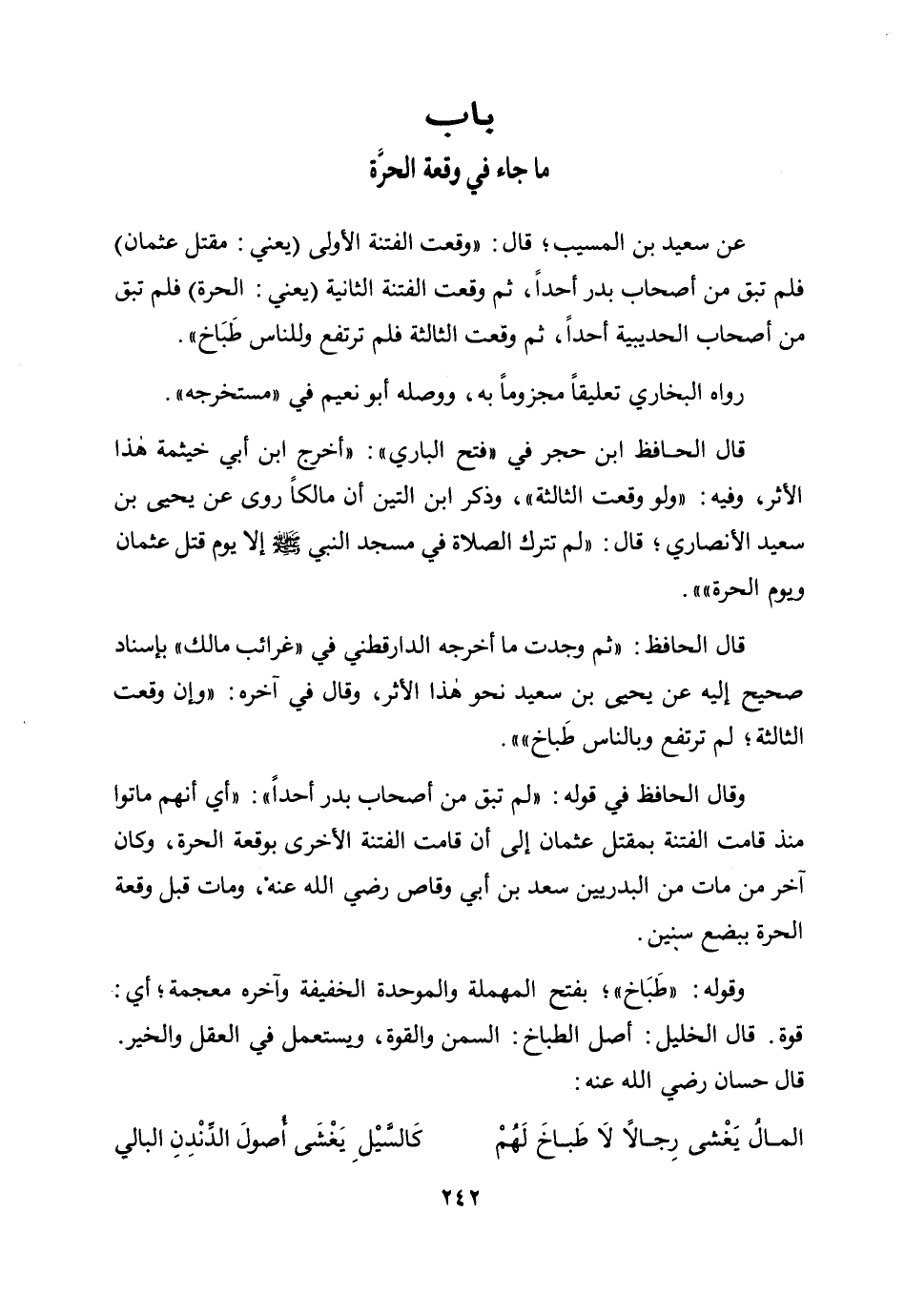 عن سعيد بن المسيب؛ قال: "وقعت الفتنة الأولى (يعني: مقتل عثمان) فلم تبق من أصحاب بدر أحدا، ثم وقعت الفتنة الثانية (يعني: الحرة) فلم تبق من أصحاب الحديبية أحدا، ثم وقعت الثالثة فلم ترتفع وللناس طباخ".