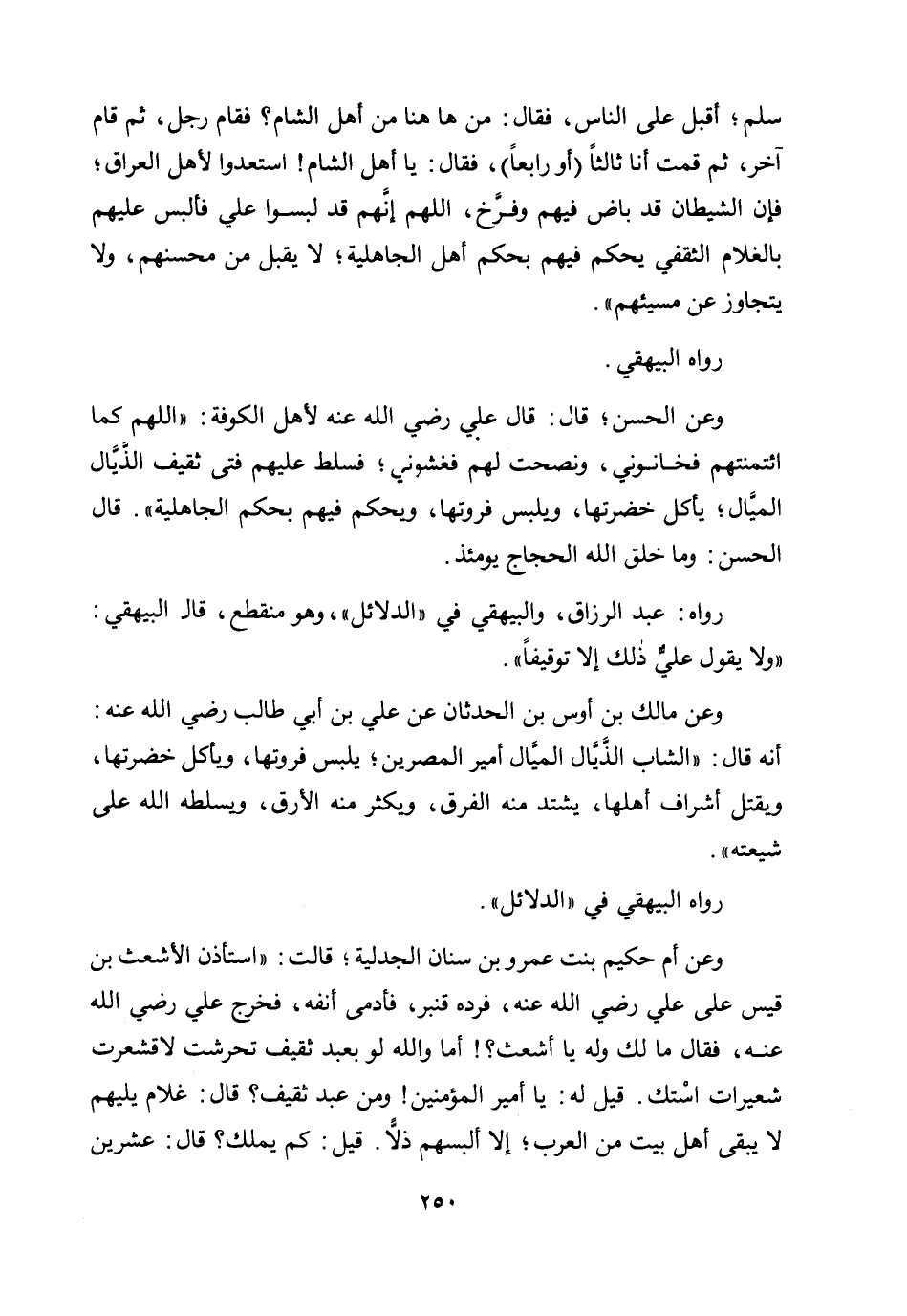 وعن مالك بن أوس بن الحدثان عن علي بن أبي طالب رضي الله عنه: أنه قال: "الشاب الذيال الميال أمير المصرين؛ يلبس فروتها، ويأكل خضرتها، ويقتل أشراف أهلها، يشتد منه الفرق، ويكثر منه الأرق، ويسلطه الله على شيعته".