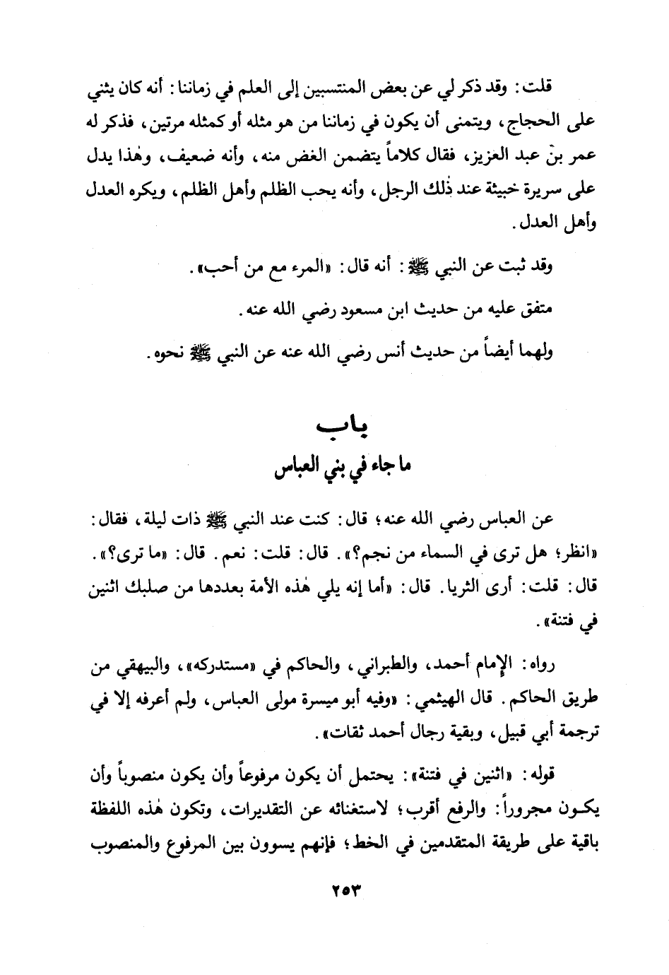 عن العباس رضي الله عنه؛ قال: كنت عند النبي صلى الله عليه وسلم ذات ليلة، فقال: «"انظر؛ هل ترى في السماء من نجم؟ ". قال: قلت: نعم. قال: "ما ترى؟ ". قال: قلت: أرى الثريا. قال: "أما إنه يلي هذه الأمة بعددها من صلبك اثنين في فتنة» .