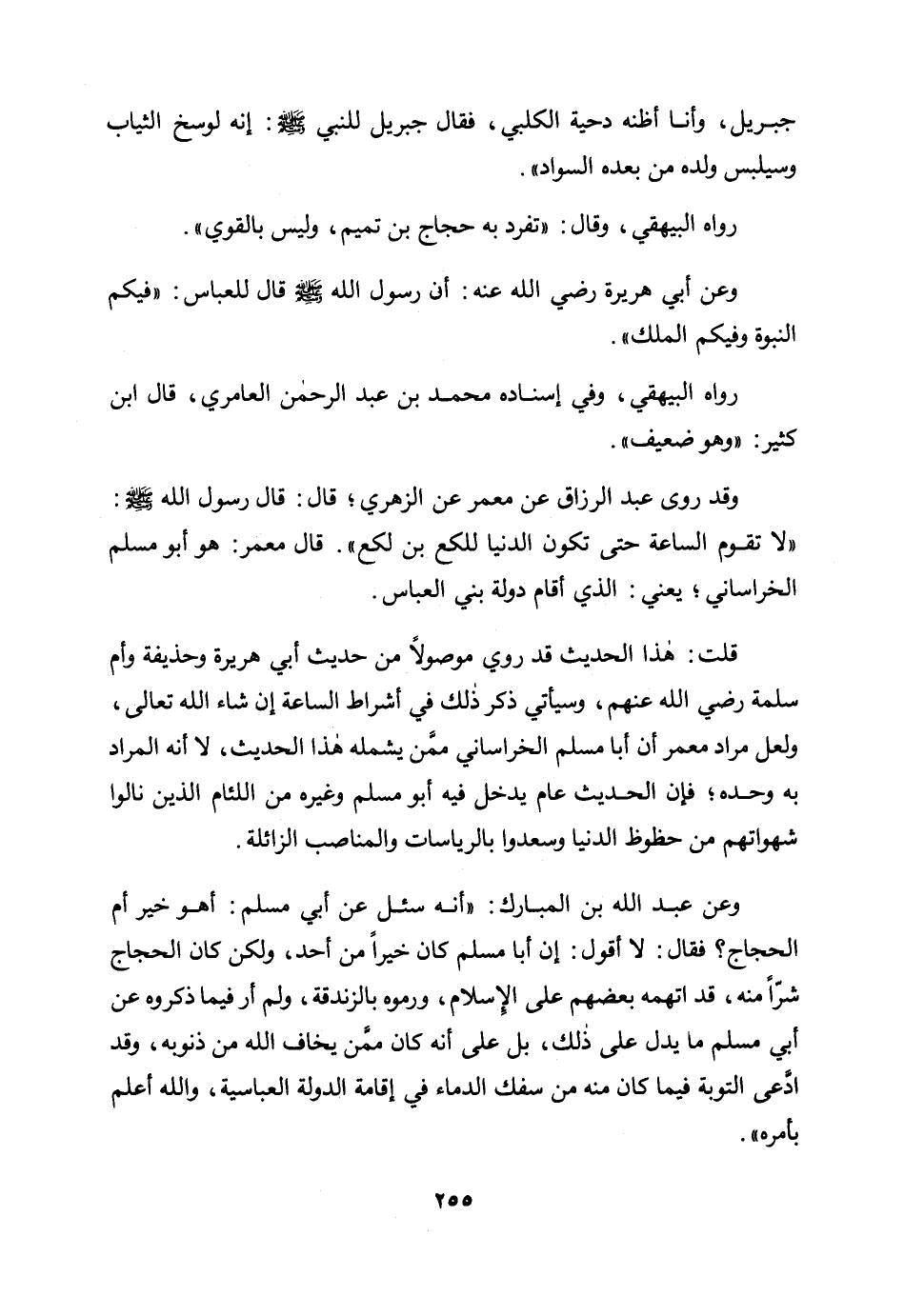 وعن عبد الله بن المبارك: "أنه سئل عن أبي مسلم: أهو خير أم الحجاج؟ فقال: لا أقول: إن أبا مسام كان خيرا من أحد، ولكن كان الحجاج شرا منه، قد اتهمه بعضهم على الإسلام، ورموه بالزندقة، ولم أر فيما ذكروه عن أبي مسلم ما يدل على ذلك، بل على أنه كان ممن يخاف الله من ذنوبه، وقد ادعى التوبة فيما كان منه من سفك الدماء في إقامة الدولة العباسية، والله أعلم بأمره".