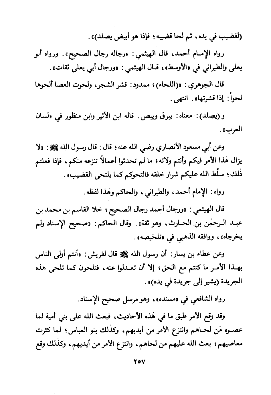 وعن عطاء بن يسار: أن رسول الله صلى الله عليه وسلم قال لقريش: «أنتم أولى الناس بهذا الأمر ما كنتم مع الحق، إلا أن تعدلوا عنه، فتلحون كما تلحى هذه الجريدة (يشير إلى جريدة في يده) » .