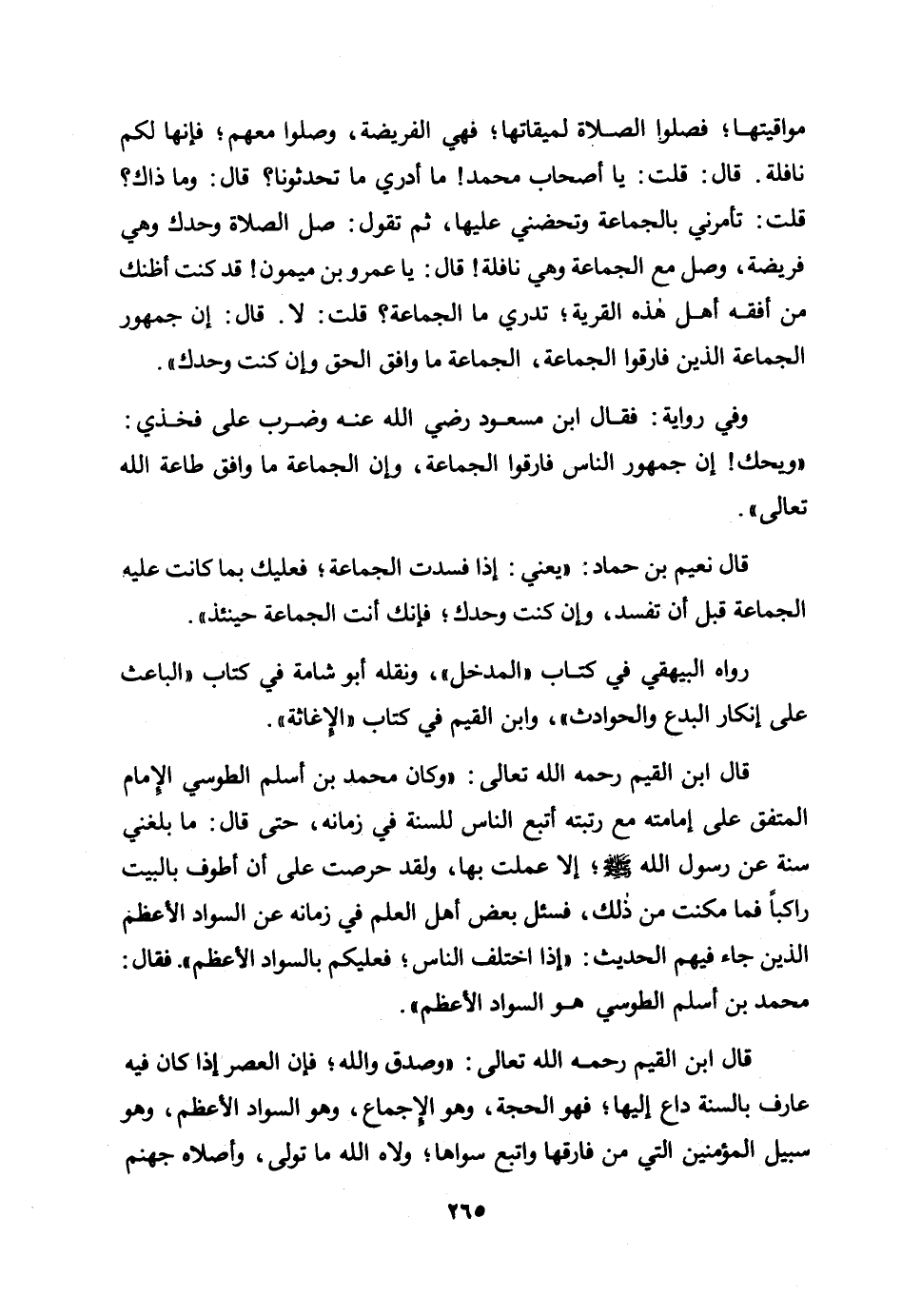 وفي رواية: فقال ابن مسعود رضي الله عنه وضرب على فخذي: "ويحك! إن جمهور الناس فارقوا الجماعة، وإن الجماعة ما وافق طاعة الله تعالى ".