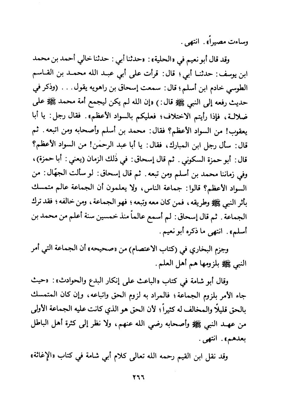 وقال أبو شامة في كتاب "الباعث على إنكار البدع والحوادث": "حيث جاء الأمر بلزوم الجماعة؛ فالمراد به لزوم الحق واتباعه، وإن كان المتمسك بالحق قليلا والمخالف له كثيرا؛ لأن الحق هو الذي كانت عليه الجماعة الأولى من عهد النبي صلى الله عليه وسلم وأصحابه رضي الله عنهم، ولا نظر إلى كثرة أهل الباطل بعدهم". انتهى.