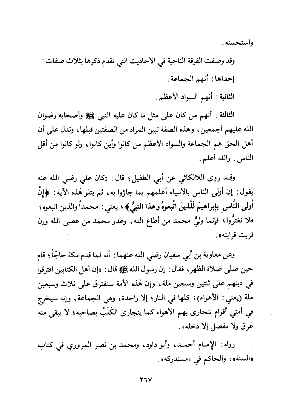 وقد وصفت الفرقة الناجية في الأحاديث التي تقدم ذكرها بثلاث صفات: