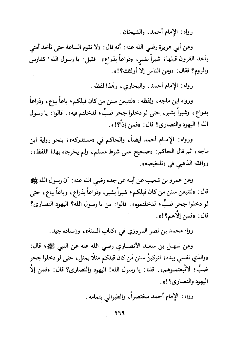 وعن عمرو بن شعيب عن أبيه عن جده رضي الله عنه: أن رسول الله صلى الله عليه وسلم قال: «لتتبعن سنن من كان قبلكم؛ شبرًا بشبر، وذراعًا بذراع، وباعًا بباع، حتى لو دخلوا جحر ضب؛ لدخلتموه. قالوا: من يا رسول الله؟ اليهود النصارى؟ قال: "فمن إلا هم؟ !» .