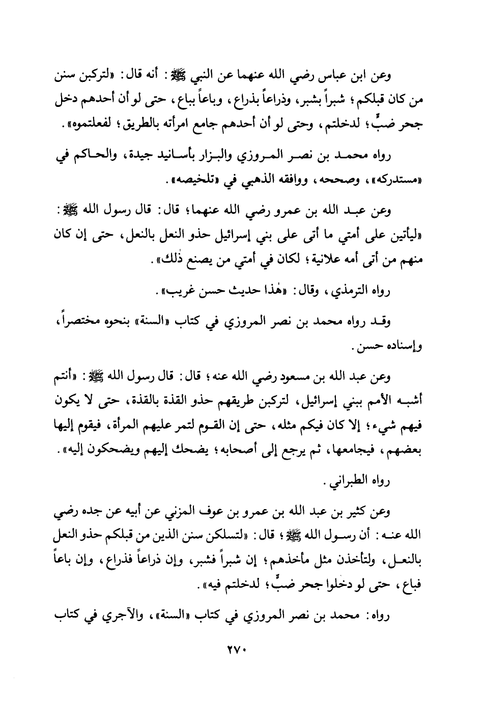 وعن كثير بن عبد الله بن عمرو بن عوف المزني عن أبيه عن جده رضي الله عنه: أن رسول الله صلى الله عليه وسلم؛ قال: «لتسلكن سنن الذين من قبلكم حذو النعل بالنعل، ولتأخذن مثل مأخذهم؛ إن شبرًا فشبر، وإن ذراعًا فذراع، وإن باعًا فباع، حتى لو دخلوا جحر ضب لدخلتم فيه» .