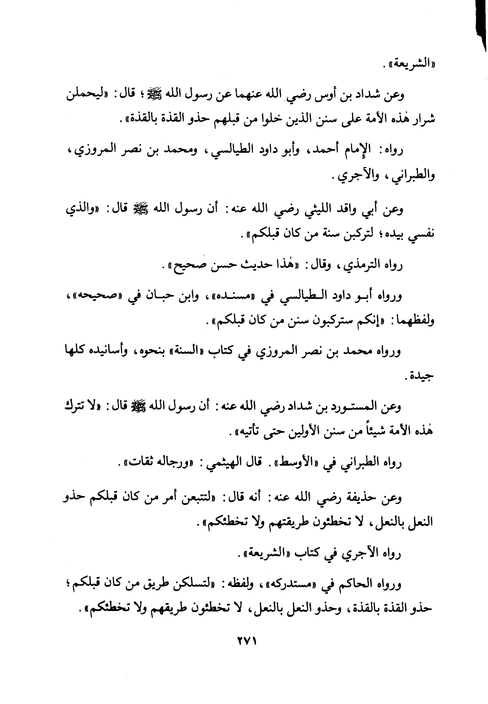 وعن شداد بن أوس رضي الله عنهما عن رسول الله صلى الله عليه وسلم؛ قال: «ليحملن شرار هذه الأمة على سنن الذين خلوا من قبلهم حذو القذة بالقذة» .