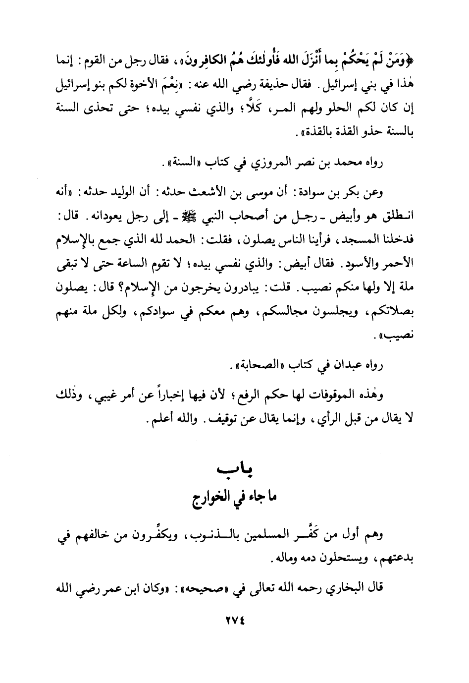 {وَمَنْ لَمْ يَحْكُمْ بِمَا أَنْزَلَ اللَّهُ فَأُولَئِكَ هُمُ الْكَافِرُونَ} ، فقال رجل من القوم: إنما هذا في بني إسرائيل. فقال حذيفة رضي الله عنه: "نعم الإخوة لكم بنو إسرائيل، إن كان لكم الحلو ولهم المر، كلا والذي نفسي بيده؛ حتى تحذى السنة بالسنة حذو القذة بالقذة".