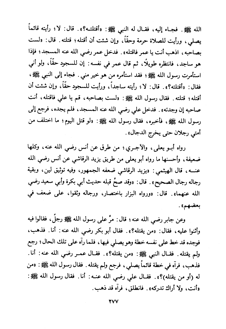 «الله صلى الله عليه وسلم. فجاء إليه، فقال له النبي صلى الله عليه وسلم: "أقتلته؟ ". قال: لا؛ رأيته قائمًا يصلي ورأيت للصلاة حرمة وحقًا، وإن شئت أن أقتله قتلته. قال: "لست بصاحبه، اذهب أنت يا عمر فاقتله". فدخل عمر رضي الله عنه المسجد فإذا هو ساجد، فانتظره طويلًا، ثم قال عمر في نفسه: إن للسجود حقًا، ولو أني استأمرت رسول الله صلى الله عليه وسلم؛ فقد استأمره من هو خير مني. فجاء إلى النبي صلى الله عليه وسلم، فقال: "أقتلته؟ ". قال: لا؛ رأيته ساجدًا، ورأيت للسجود حقًا، وإن شئت أن أقتله قتلته. فقال رسول الله صلى الله عليه وسلم: "لست بصاحبه، قم يا علي فاقتله، أنت صاحبه إن وجدته". فدخل علي رضي الله عنه المسجد، فلم يجده، فرجع إلى رسول الله صلى الله عليه وسلم، فأخبره، فقال رسول الله صلى الله عليه وسلم: "لو قتل اليوم ما اختلف من أمتي رجلان حتى يخرج الدجال» .