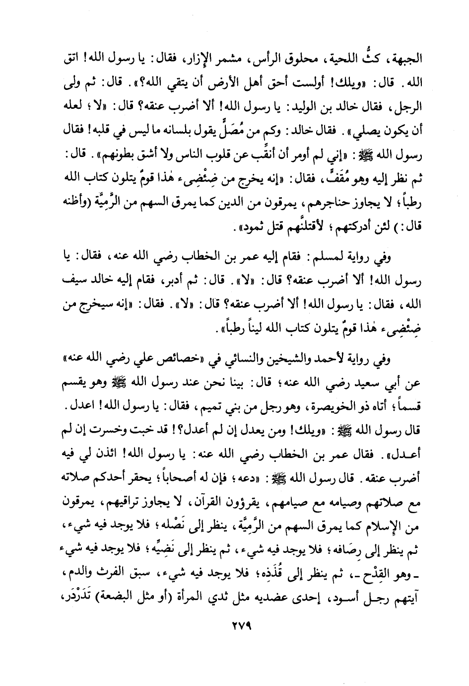 وفي رواية لمسلم: «فقام إليه عمر بن الخطاب رضي الله عنه، فقال: يا رسول الله! ألا أضرب عنقه؟ قال: "لا ". قال: ثم أدبر، فقام إليه خالد سيف الله، فقال: يا رسول الله! ألا أضرب عنقه؟ قال: "لا". فقال: "إنه سيخرج من ضئضئ هذا قوم يتلون كتاب الله لينًا رطبًا» .