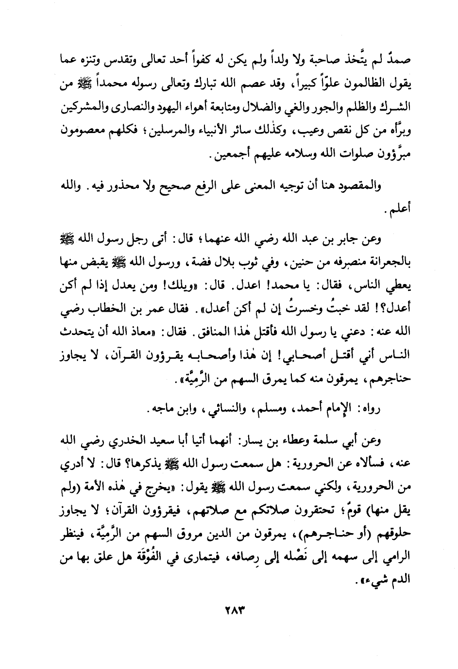 وعن جابر بن عبد الله رضي الله عنهما؛ قال: «أتى رجل رسول الله صلى الله عليه وسلم بالجعرانة منصرفه من حنين، وفي ثوب بلال فضة، ورسول الله صلى الله عليه وسلم يقبض منها يعطي الناس، فقال: يا محمد! اعدل. قال: ويلك! ومن يعدل إذا لم أكن أعدل؟ ! لقد خبت وخسرت إن لم أكن أعدل. فقال عمر بن الخطاب رضي الله عنه: دعني يا رسول الله فأقتل هذا المنافق. فقال: "معاذ الله أن يتحدث الناس أني أقتل أصحابي! إن هذا وأصحابه يقرؤون القرآن، لا يجاوز حناجرهم، يمرقون منه كما يمرق السهم من الرمية» .