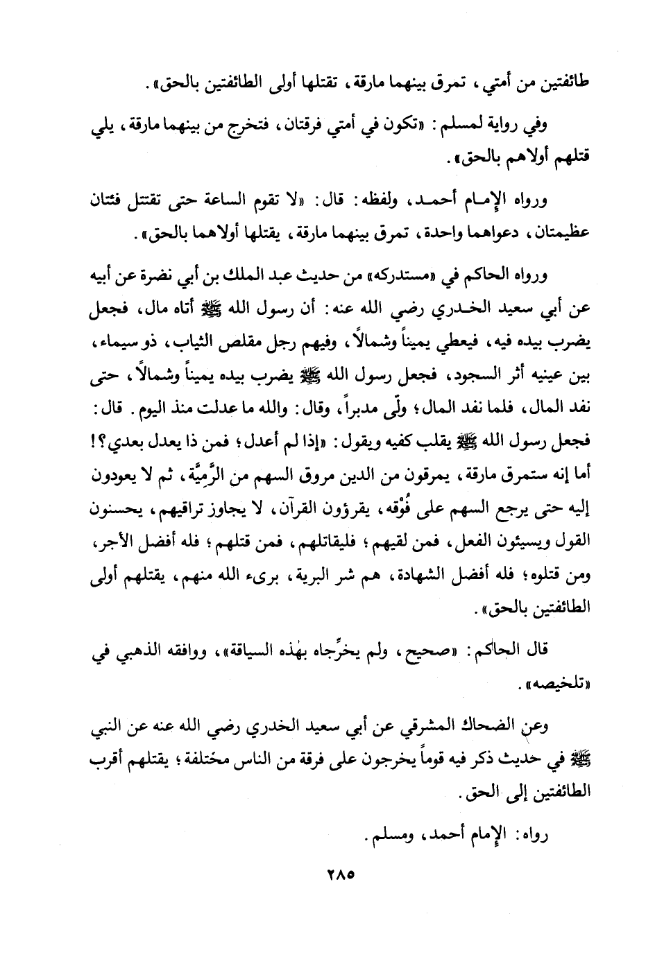 ورواه الحاكم في "مستدركه" من حديث عبد الملك بن أبي نضرة عن أبيه عن أبي سعيد الخدري رضي الله عنه: «أن رسول الله صلى الله عليه وسلم أتاه مال، فجعل يضرب بيده فيه، فيعطي يمينًا وشمالًا، وفيهم رجل مقلص الثياب، ذو سيماء، بين عينيه أثر السجود، فجعل رسول الله صلى الله عليه وسلم يضرب بيده يمينًا وشمالًا، حتى نفد المال، فلما نفد المال؛ ولى مدبرًا، وقال: والله ما عدلت منذ اليوم. قال: فجعل رسول الله صلى الله عليه وسلم يقلب كفيه ويقول: "إذا لم أعدل؛ فمن ذا يعدل بعدي؟ ! أما إنه ستمرق مارقة، يمرقون من الدين مروق السهم من الرمية، ثم لا يعودون إليه حتى يرجع السهم على فوقه، يقرؤون القرآن لا يجاوز تراقيهم، يحسنون القول ويسيئون الفعل، فمن لقيهم فليقاتلهم، فمن قتلهم فله أفضل الأجر، ومن قتلوه فله أفضل الشهادة، هم شر البرية، برئ الله منهم، يقتلهم أولى الطائفتين بالحق» .