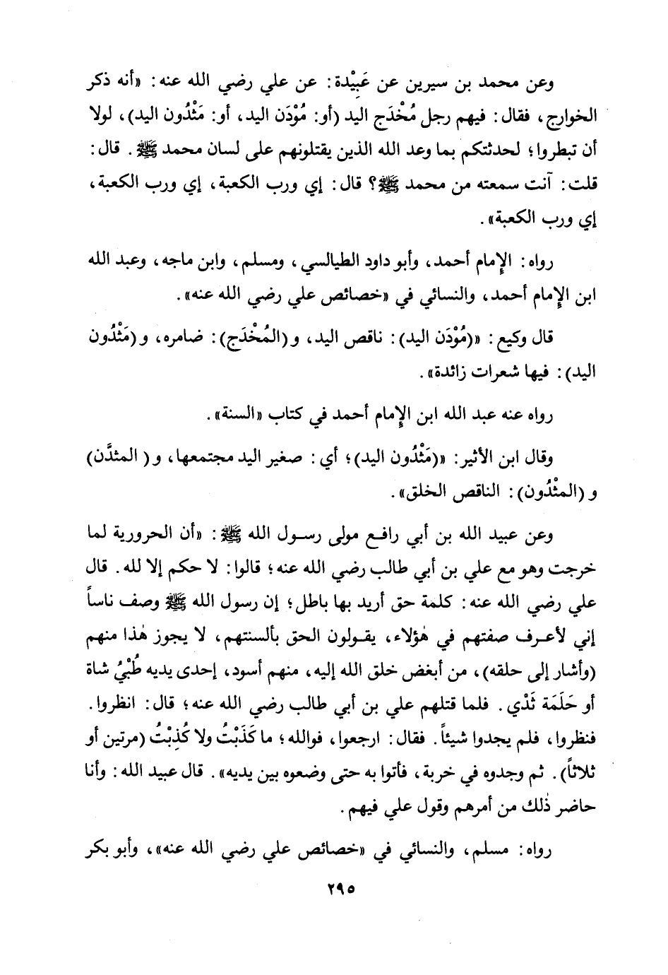 وعن محمد بن سيرين عن عبيدة: عن علي رضي الله عنه: "أنه ذكر الخوارج، فقال: فيهم رجل مخدج اليد (أو: مودن اليد، أو: مثدون اليد) ، لولا أن تبطروا لحدثتكم بما وعد الله الذين يقتلونهم على لسان محمد صلى الله عليه وسلم. قال: قلت: آنت سمعته من محمد صلى الله عليه وسلم؟ قال: إي ورب الكعبة، إي ورب الكعبة، إي ورب الكعبة".