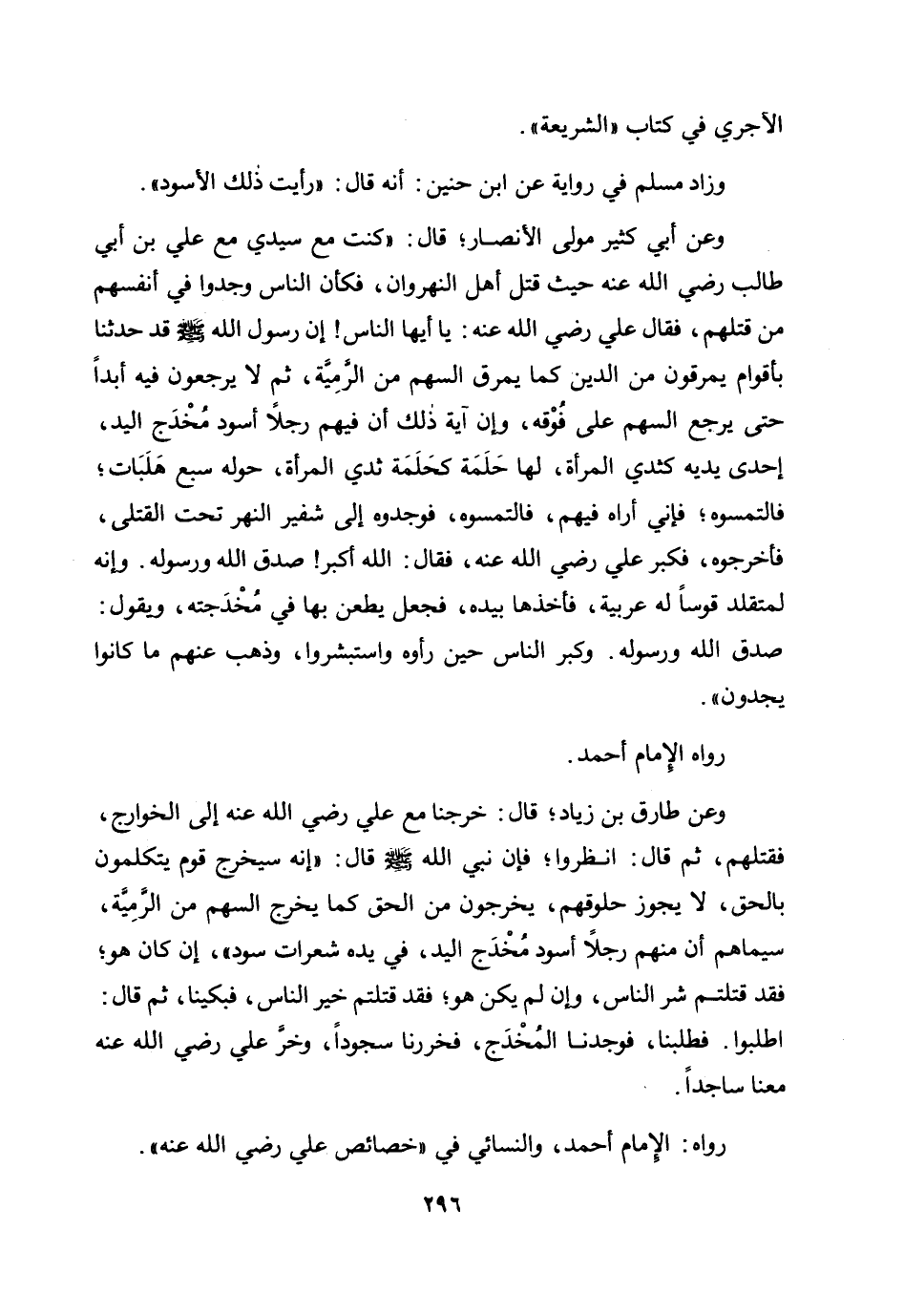 وعن أبي كثير مولى الأنصار؛ قال: "كنت مع سيدي مع علي بن أبي طالب رضي الله عنه حيث قتل أهل النهروان، فكأن الناس وجدوا في أنفسهم من قتلهم، فقال علي رضي الله عنه: يا أيها الناس! إن رسول الله صلى الله عليه وسلم قد حدثنا بأقوام يمرقون من الدين كما يمرق السهم من الرمية، ثم لا يرجعون فيه أبدا حتى يرجع السهم على فوقه، وإن آية ذلك أن فيهم رجلا أسود مخدج اليد، إحدى يديه كثدي المرأة، لها حلمة كحلمة ثدي المرأة، حوله سبع هلبات؛ فالتمسوه؛ فإني أراه فيهم، فالتمسوه، فوجدوه إلى شفير النهر تحت القتلى، فأخرجوه، فكبر علي رضي الله عنه، فقال: الله أكبر! صدق الله ورسوله. وإنه لمتقلد قوسا له عربية، فأخذها بيده، فجعل يطعن بها في مخدجته، ويقول: صدق الله ورسوله. وكبر الناس حين رأوه واستبشروا، وذهب عنهم ما كانوا يجدون".