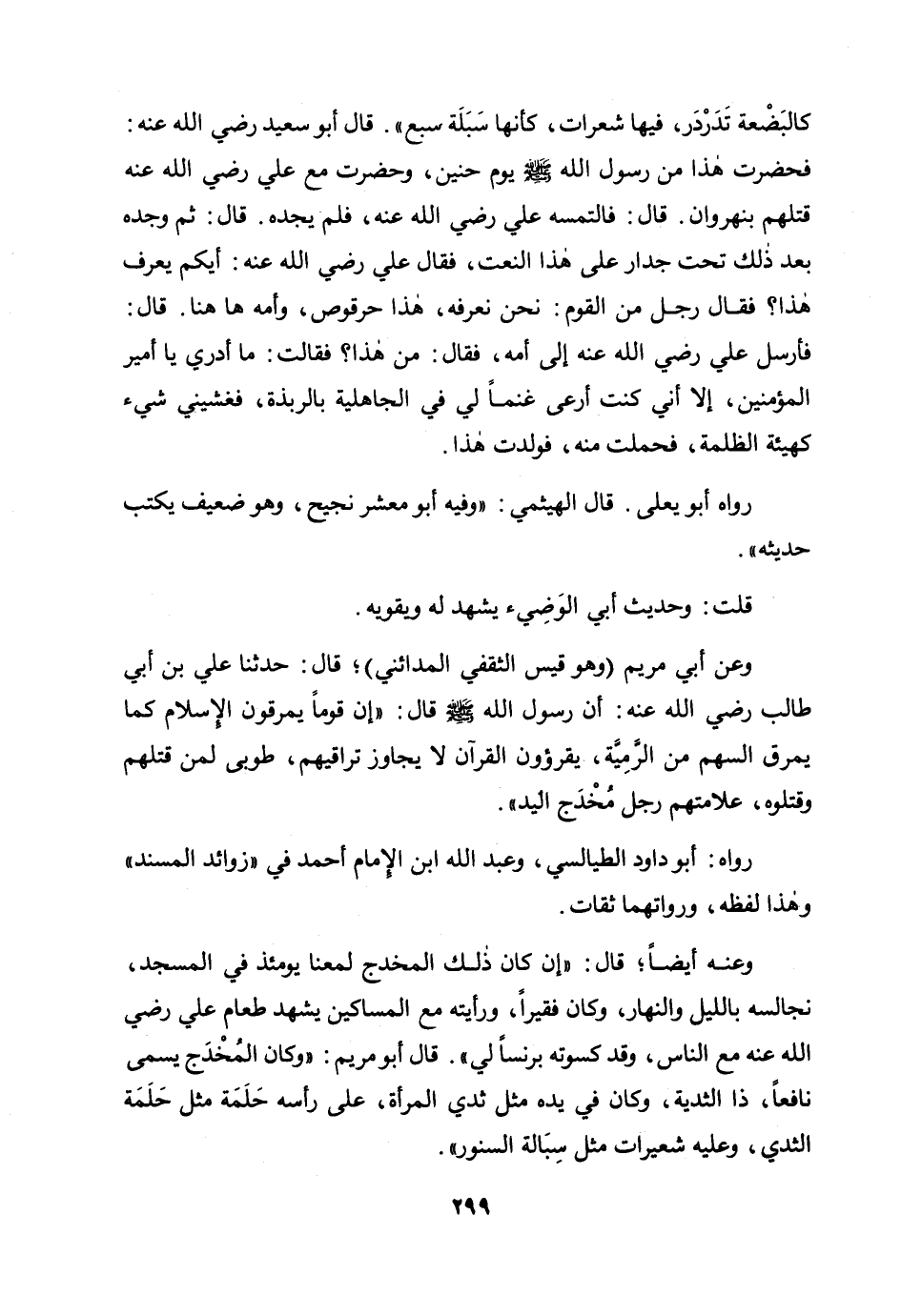 وعن أبي مريم (وهو قيس الثقفي المدائني) ؛ قال: حدثنا علي بن أبي طالب رضي الله عنه: أن رسول الله صلى الله عليه وسلم قال: «إن قومًا يمرقون من الإسلام كما يمرق السهم من الرمية، يقرؤون القرآن لا يجاوز تراقيهم، طوبى لمن قتلهم وقتلوه، علامتهم رجل مخدج اليد» .