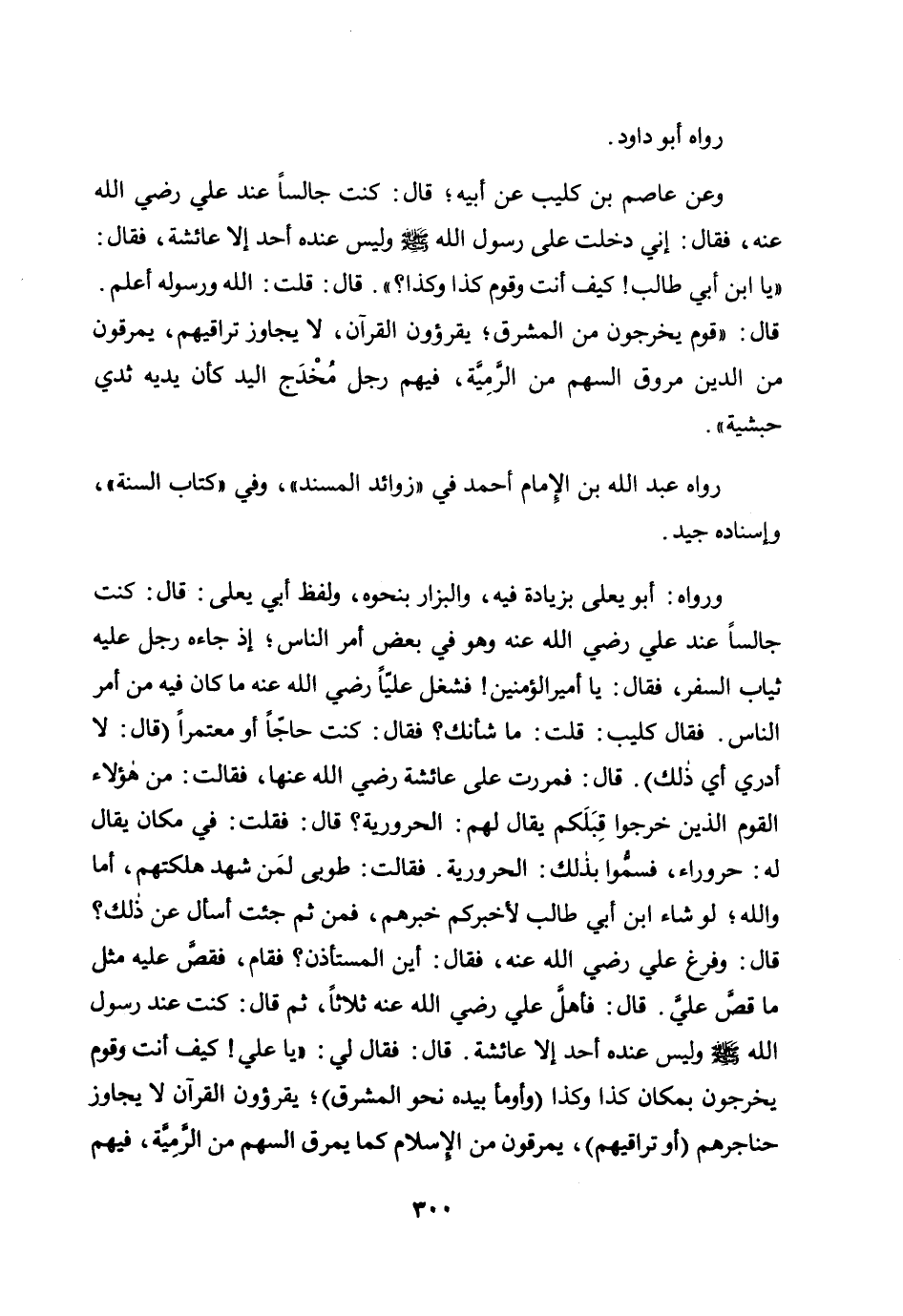 وعن عاصم بن كليب عن أبيه؛ قال: كنت جالسا عند علي رضي الله عنه، فقال: إني دخلت على رسول الله صلى الله عليه وسلم وليس عنده أحد إلا عائشة، فقال: «" يابن أبي طالب! كيف أنت وقوم كذا وكذا؟ ". قال: قلت: الله ورسوله أعلم. قال: "قوم يخرجون من المشرق؛ يقرؤون القرآن لا يجاوز تراقيهم، يمرقون من الدين مروق السهم من الرمية، فيهم رجل مخدج اليد كأن يديه ثدي حبشية» .