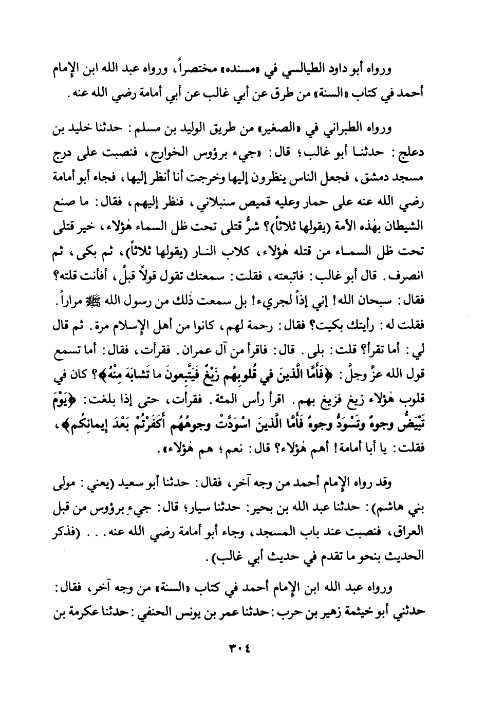 ورواه الطبراني في "الصغير" من طريق الوليد بن مسلم: حدثنا خليد بن دعلج: حدثنا أبو غالب؛ قال: "جيء برؤوس الخوارج، فنصبت على درج مسجد دمشق، فجعل الناس ينظرون إليها وخرجت أنا أنظر إليها، فجاء أبو أمامة رضي الله عنه على حمار وعليه قميص سنبلاني، فنظر إليهم، فقال: ما صنع الشيطان بهذه الأمة (يقولها ثلاثا) ؟ شر قتلى تحت ظل السماء هؤلاء، خير قتلى تحت ظل السماء من قتله هؤلاء، كلاب النار (يقولها ثلاثا) ، ثم بكى، ثم انصرف. قال أبو غالب: فاتبعته، فقلت: سمعتك تقول قولا قبل، أفأنت قلته؟ فقال: سبحان الله! إني إذا لجريء! بل سمعت ذلك من رسول الله صلى الله عليه وسلم مرارا. فقلت له: رأيتك بكيت، فقال: رحمة لهم، كانوا من أهل الإسلام مرة. ثم قال لي: أما تقرأ؟ قلت: بلى. قال: فاقرأ من آل عمران. فقرأت، فقال: أما تسمع قول الله عز وجل: {فَأَمَّا الَّذِينَ فِي قُلُوبِهِمْ زَيْغٌ فَيَتَّبِعُونَ مَا تَشَابَهَ مِنْهُ} ؟ كان في قلوب هؤلاء زيغ فزيغ بهم. اقرأ رأس المائة. فقرأت، حتى إذا بلغت: {يَوْمَ تَبْيَضُّ وُجُوهٌ وَتَسْوَدُّ وُجُوهٌ فَأَمَّا الَّذِينَ اسْوَدَّتْ وُجُوهُهُمْ أَكَفَرْتُمْ بَعْدَ إِيمَانِكُمْ} ، فقلت: يا أبا أمامة! أهم هؤلاء؟ قال: نعم؛ هم هؤلاء ".