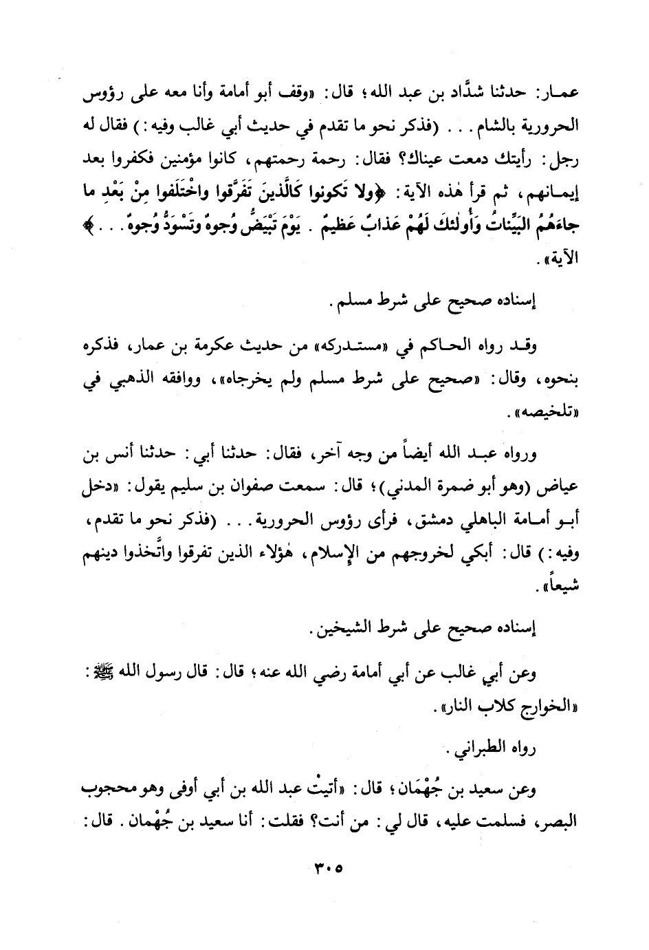 عمار: حدثنا شداد بن عبد الله؛ قال: "وقف أبو أمامة وأنا معه على رؤوس الحرورية بالشام (فذكر نحو ما تقدم في حديث أبي غالب، وفيه:) فقال له رجل: رأيتك دمعت عيناك، فقال: رحمة رحمتهم، كانوا مؤمنين فكفروا بعد إيمانهم، ثم قرأ هذه الآية: {وَلَا تَكُونُوا كَالَّذِينَ تَفَرَّقُوا وَاخْتَلَفُوا مِنْ بَعْدِ مَا جَاءَهُمُ الْبَيِّنَاتُ وَأُولَئِكَ لَهُمْ عَذَابٌ عَظِيمٌ يَوْمَ تَبْيَضُّ وُجُوهٌ وَتَسْوَدُّ وُجُوهٌ} ........... الآية ".