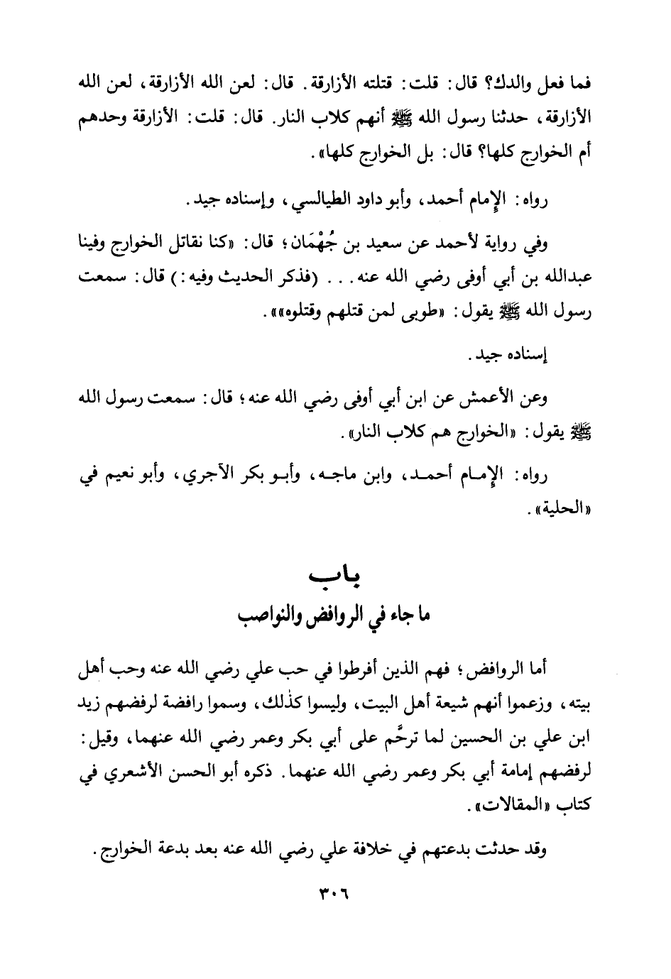 فما فعل والدك؟ قال: قلت: قتلته الأزارقة. قال: لعن الله الأزارقة، لعن الله الأزارقة، «حدثنا رسول الله صلى الله عليه وسلم أنهم كلاب النار» . قال: قلت: الأزارقة وحدهم أم الخوارج كلها؟ قال: بل الخوارج كلها".