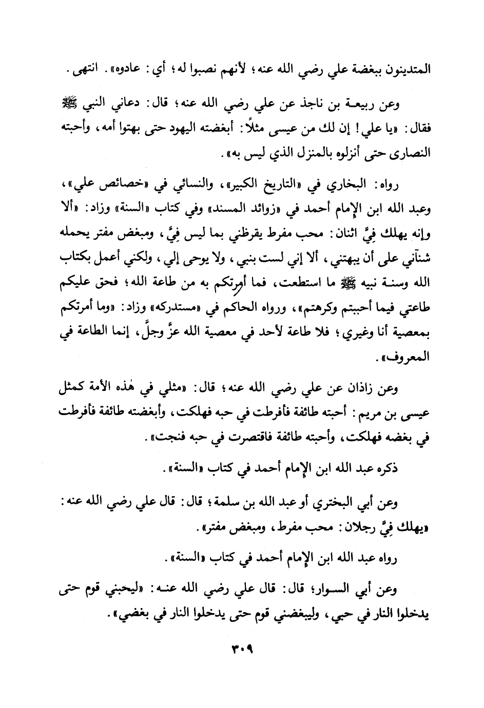 رواه: البخاري في "التاريخ الكبير"، والنسائي في "خصائص علي "، وعبد الله ابن الإمام أحمد في "زوائد المسند" وفي كتاب "السنة" وزاد: " ألا وإنه يهلك في اثنان: محب مفرط يقرظني بما ليس في، ومبغض مفتر يحمله شنآني على أن يبهتني، ألا إني لست بنبي، ولا يوحى إلي، ولكني أعمل بكتاب الله وسنة نبيه صلى الله عليه وسلم ما استطعت، فما أمرتكم به من طاعة الله فحق عليكم طاعتي فيما أحببتم وكرهتم"، ورواه الحاكم في "مستدركه" وزاد: "وما أمرتكم بمعصية أنا وغيري فلا طاعة لأحد في معصية الله عز وجل، إنما الطاعة في المعروف".