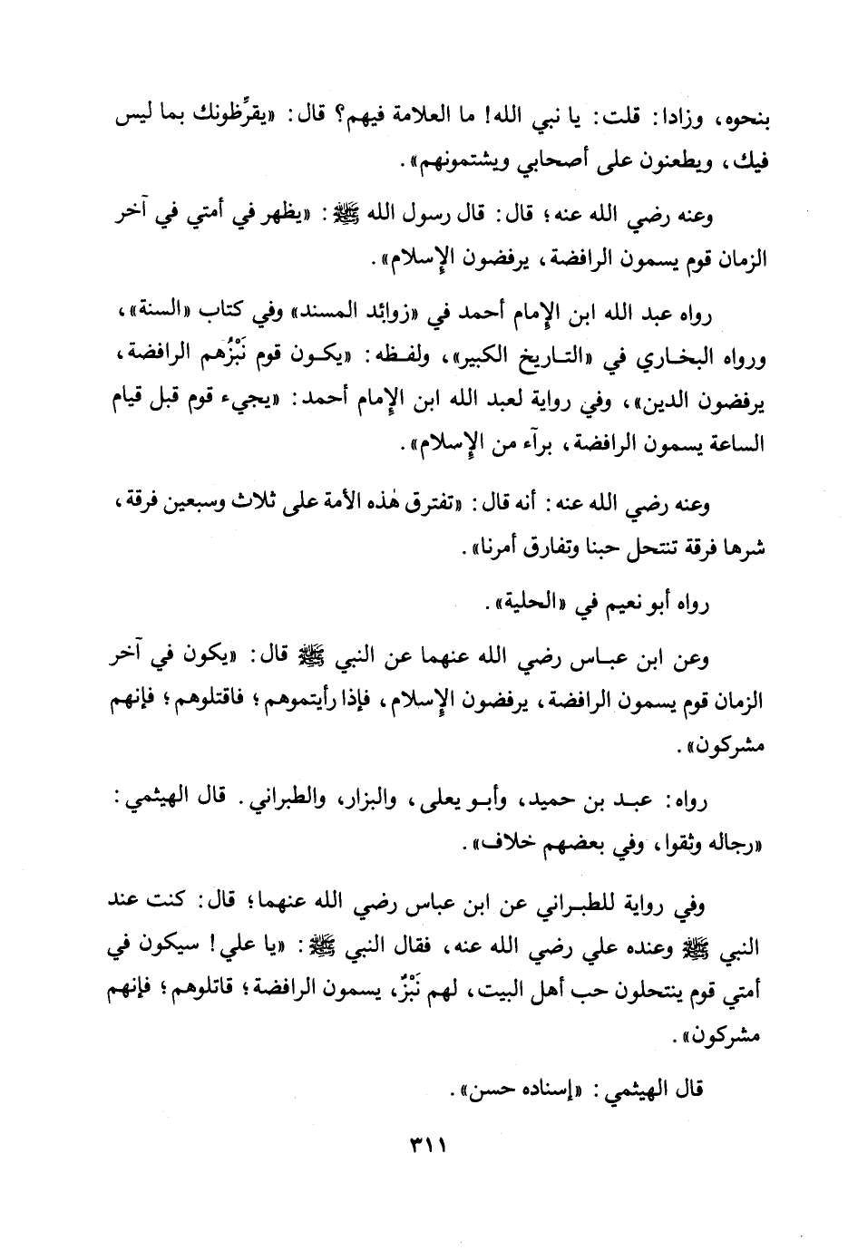وعن ابن عباس رضي الله عنهما عن النبي صلى الله عليه وسلم قال: «يكون في آخر الزمان قوم يسمون الرافضة، يرفضون الإسلام، فإذا رأيتموهم فاقتلوهم؛ فإنهم مشركون» .