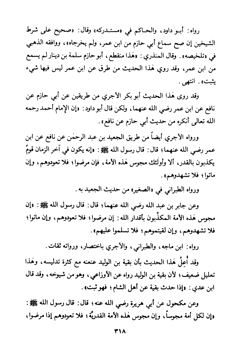 ورواه الآجري أيضا من طريق الجعيد بن عبد الرحمن عن نافع عن ابن عمر رضي الله عنهما؛ قال: قال رسول الله صلى الله عليه وسلم: «إنه سيكون في آخر الزمان قوم يكذبون بالقدر، ألا وأولئك مجوس هذه الأمة، فإن مرضوا فلا تعودوهم، وإن ماتوا فلا تشهدوهم» .