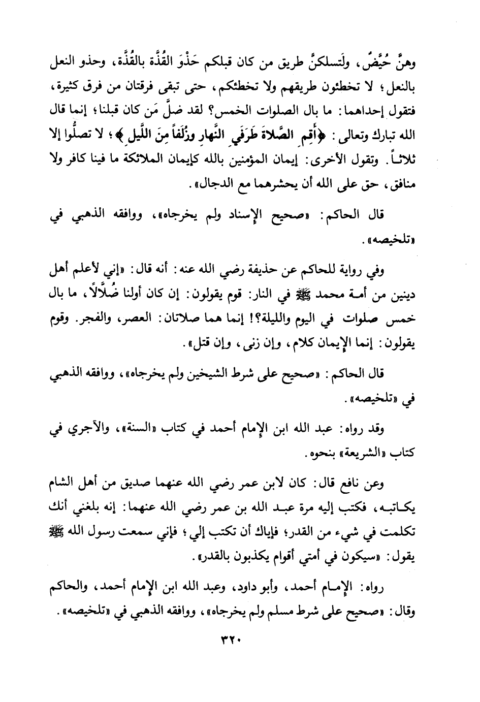 وفي رواية للحاكم عن حذيفة رضي الله عنه: أنه قال: "إني لأعلم أهل دينين من أمة صلى الله عليه وسلم في النار: قوم يقولون: إن كان أولنا ضلالا، ما بال خمس صلوات في اليوم والليلة؟ ! إنما هما صلاتان: العصر، والفجر. وقوم يقولون: إنما الإيمان كلام، وإن زنى وإن قتل".