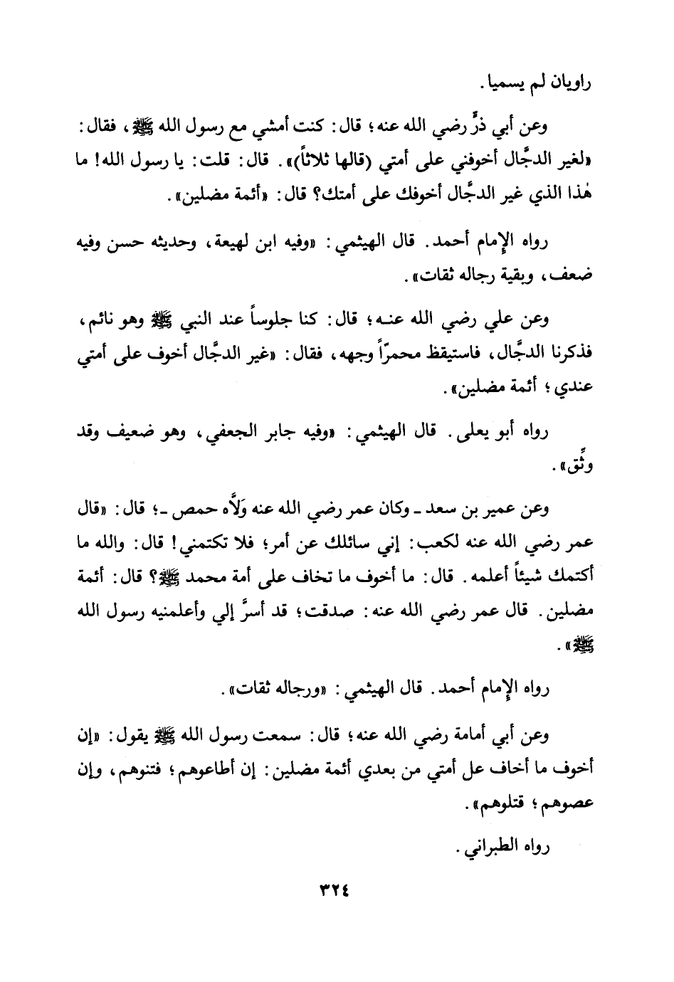 «وعن أبي ذر رضي الله عنه؛ قال: كنت أمشي مع رسول الله صلى الله عليه وسلم، فقال: "لغير الدجال أخوفني على أمتي (قالها ثلاثًا) ". قال: قلت: يا رسول الله! ما هذا الذي غير الدجال أخوفك على أمتك؟ قال: "أئمة مضلين» .