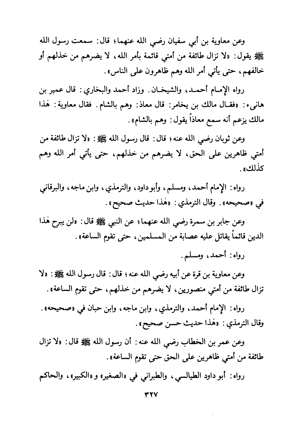 وعن عمر بن الخطاب رضي الله عنه: أن رسول الله صلى الله عليه وسلم قال: «لا تزال طائفة من أمتي ظاهرين على الحق حتى تقوم الساعة» .