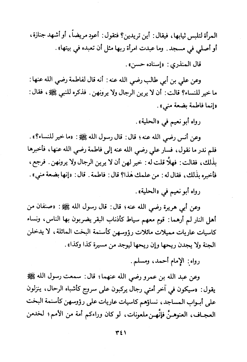 وعن عبد الله بن عمرو رضي الله عنهما؛ قال: سمعت رسول الله صلى الله عليه وسلم يقول: «سيكون في آخر أمتي رجال يركبون على سروج كأشباه الرحال، ينزلون على أبواب المساجد، نساؤهم كاسيات عاريات على رؤوسهن كأسنمة البخت العجاف، العنوهن فإنهن ملعونات، لو كان وراءكم أمة من الأمم لخدمن»