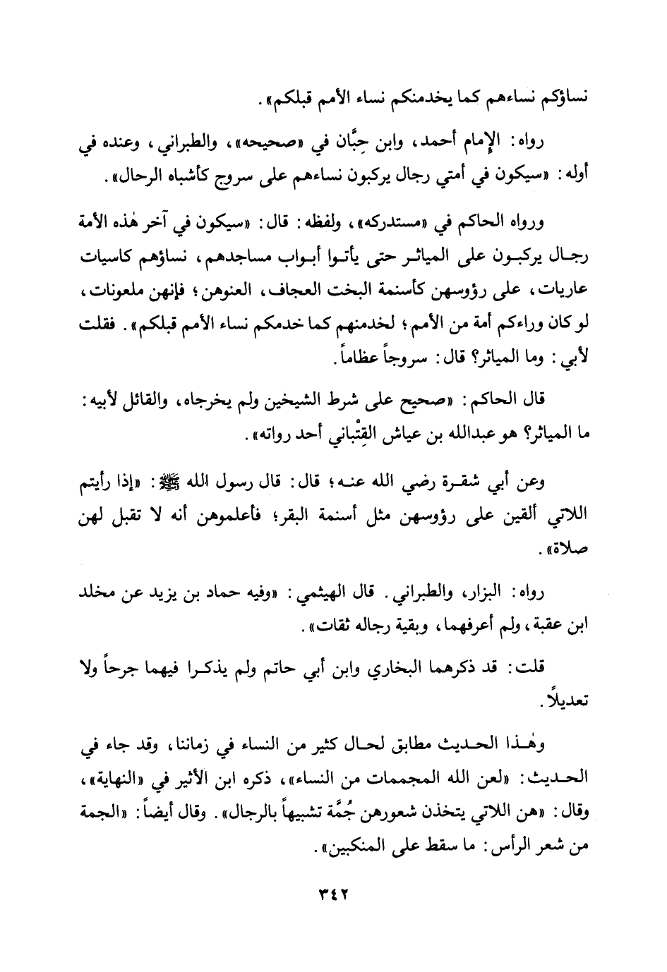 ورواه الحاكم في "مستدركه"، ولفظه: قال: «سيكون في آخر هذه الأمة رجال يركبون على المياثر حتى يأتوا أبواب مساجدهم، نساؤهم كاسيات عاريات، على رؤوسهن كأسنمة البخت العجاف، العنوهن فإنهن ملعونات، لو كان وراءكم أمة من الأمم لخدمنهم كما خدمكم نساء الأمم قبلكم. فقلت لأبي: وما المياثر؟ قال: سروجا عظاما» .