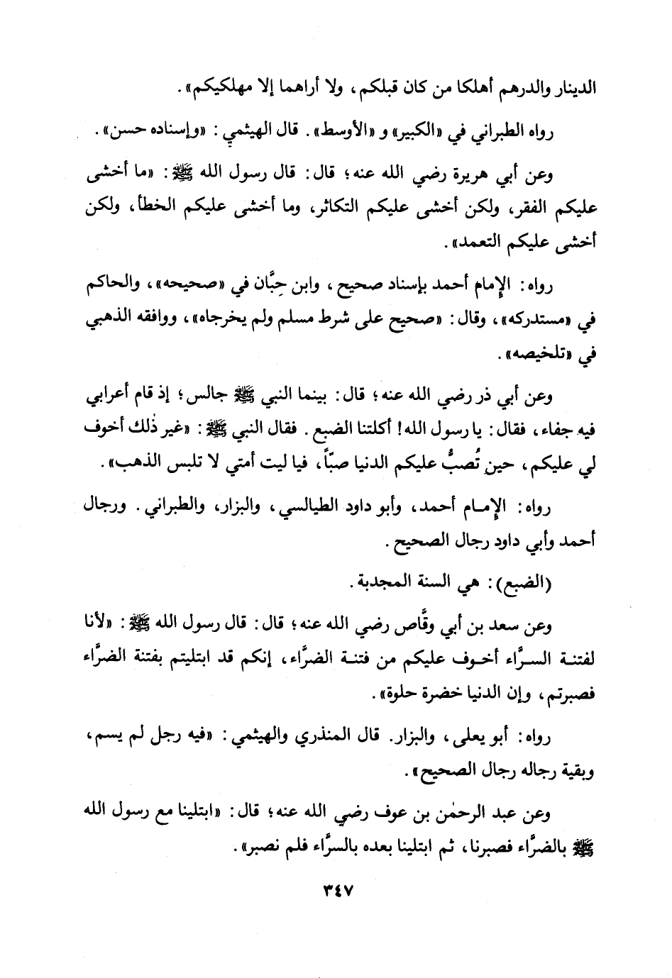 وعن سعد بن أبي وقاص رضي الله عنه؛ قال: قال رسول الله صلى الله عليه وسلم: «لأنا لفتنة السراء أخوف عليكم من فتنة الضراء، إنكم قد ابتليتم بفتنة الضراء فصبرتم، وإن الدنيا خضرة حلوة» .