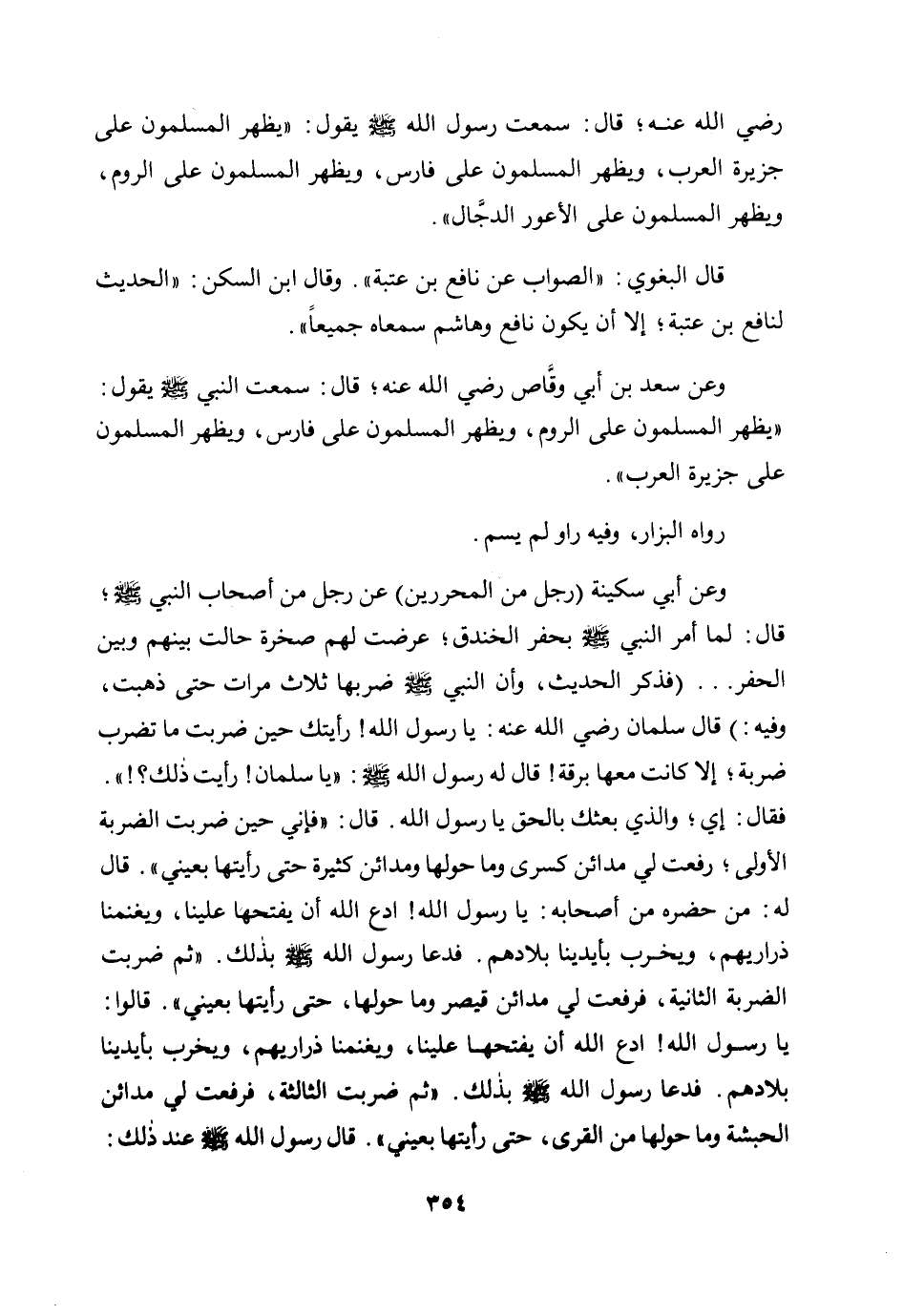 وعن سعد بن أبي وقاص رضي الله عنه؛ قال: سمعت النبي صلى الله عليه وسلم يقول: «يظهر المسلمون على الروم، ويظهر المسلمون على فارس، ويظهر المسلمون على جزيرة العرب» .