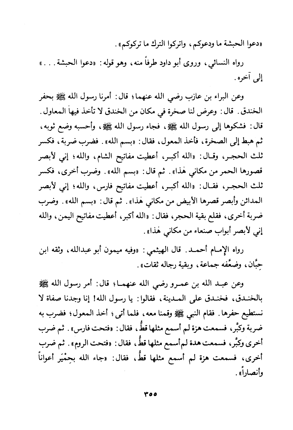 وعن البراء بن عازب رضي الله عنهما؛ قال: «أمرنا رسول الله صلى الله عليه وسلم بحفر الخندق. قال: وعرض لنا صخرة في مكان من الخندق لا تأخذ فيها المعاول. قال: فشكوها إلى رسول الله صلى الله عليه وسلم، فجاء رسول الله صلى الله عليه وسلم، وأحسبه وضع ثوبه، ثم هبط إلى الصخرة، فأخذ المعول، فقال: "بسم الله". فضرب ضربة، فكسر ثلث الحجر، وقال: "الله أكبر، أعطيت مفاتيح الشام، والله إني لأبصر قصورها الحمر من مكاني هذا". ثم قال: "بسم الله". وضرب أخرى، فكسر ثلث الحجر، فقال: "الله أكبر، أعطيت مفاتيح فارس، والله إني لأبصر المدائن وأبصر قصرها الأبيض من مكاني هذا". ثم قال: "بسم الله". وضرب ضربة أخرى، فقلع بقية الحجر، فقال: "الله أكبر، أعطيت مفاتيح اليمن، والله إني لأبصر أبواب صنعاء من مكاني هذا» .